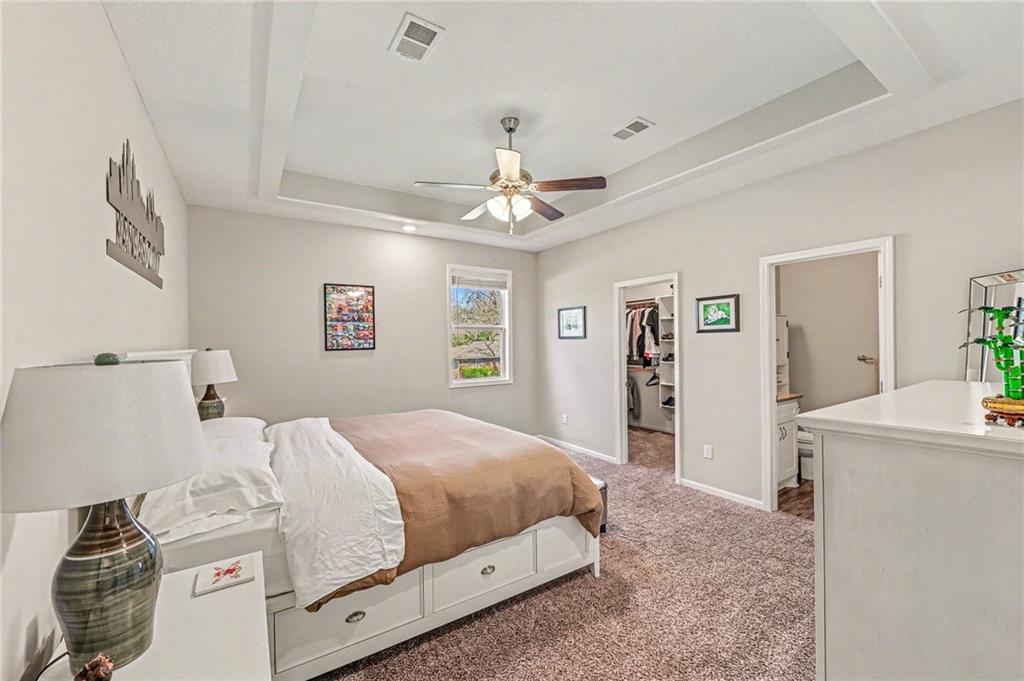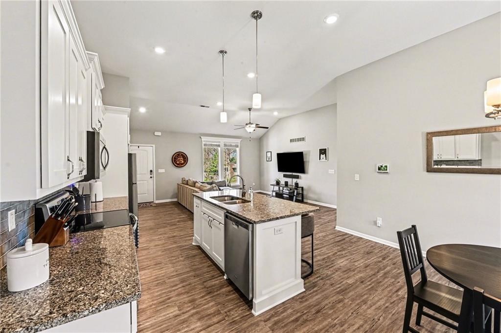 This charming home offers great curb appeal with beautifully landscaped front yard. When you step inside, you are welcomed by a spacious layout featuring vaulted ceilings and LVP flooring that immediately make the home feel open and inviting. The kitchen boasts crisp white cabinetry, stainless steel appliances, a walk in pantry, and a dining area just off to the side. This open concept space flows nicely and provides plenty of room for everyday living and entertaining. The primary bedroom features vaulted ceilings, a private full bathroom, and a walk in closet. Two additional bedrooms are located on the main floor, along with another full bathroom, a convenient laundry room, and a versatile bonus room that could be used as an office, playroom, or hobby space. Additional highlights include a two car garage and solar panels for added efficiency. Step outside to a large, fully fenced backyard with mature trees and a storage shed, offering plenty of space to relax or entertain.