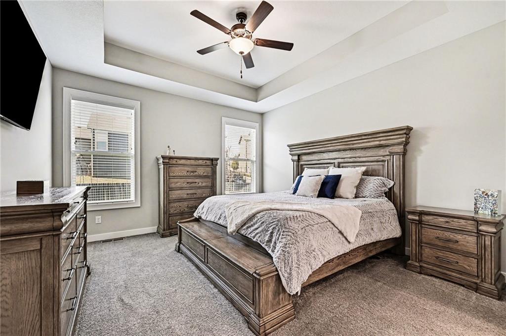 Located in a newer neighborhood that's still growing, this reverse ranch feels like a nearly new home. Built just four years ago by Summit Homes, it has a modern layout with finishes that are fresh, clean, and ready for you to move into. The home offers 4 bedrooms and 3 full bathrooms. The main level has approximately 1,544 sq. ft. of living space, and the basement adds another 988 sq. ft. of finished area. The open layout on the main floor makes it easy to flow from the kitchen to the dining area and living room. The kitchen has great finishes and a design that works well for both everyday meals and entertainment, plus there’s a mudroom and pantry near the three-car garage for extra convenience. The primary suite is on the main level for privacy and comfort, with a spacious bedroom, a well-designed bathroom, and direct access to a walk-in closet. A second bedroom and full bathroom near the front offer flexibility for guests or an office. Downstairs, the large family room is great for hanging out, with a wet bar that's great for hosting. Two more bedrooms share a Jack-and-Jill bathroom, and there’s unfinished space for extra storage. Egress windows bring in natural light and make the lower level feel bright and welcoming. Outside, you’ll find a covered concrete patio right off the dining area—perfect for quiet evenings or entertaining guests. The yard has an in-ground sprinkler system, and the home comes with a security system for peace of mind. With 2,532 sq. ft. of finished space, a three-car garage, and a location in a growing part of Blue Springs area, this home blends modern style, useful space, and everyday comfort—ideal for those who want something that feels new without the hassle of starting from scratch.