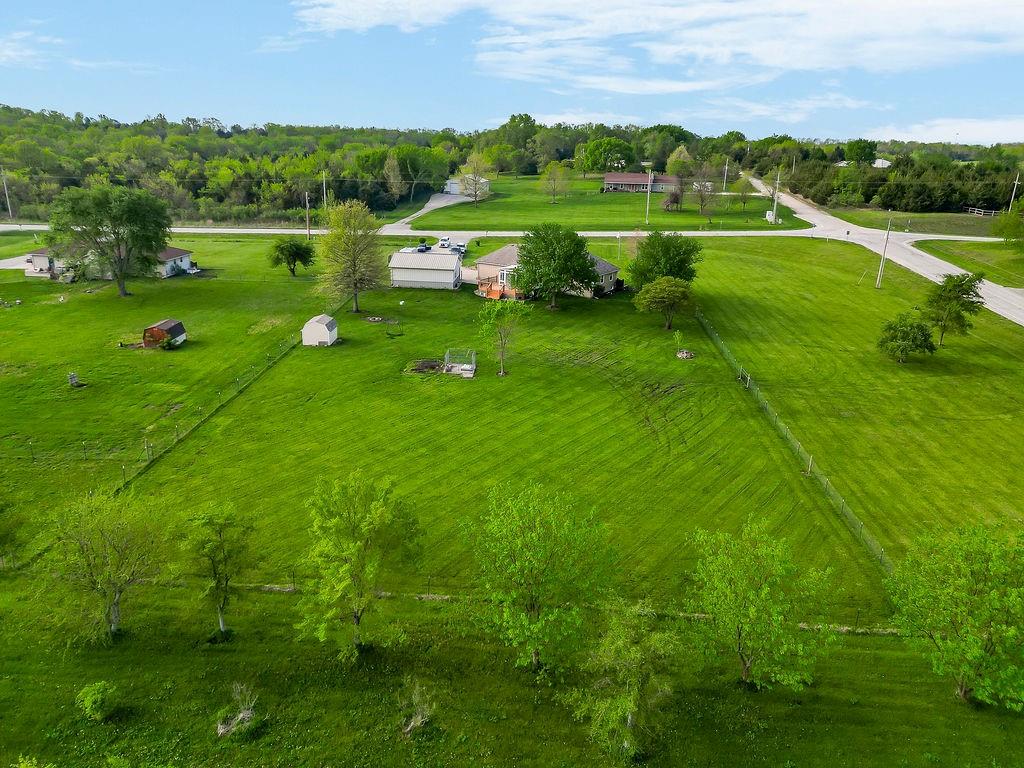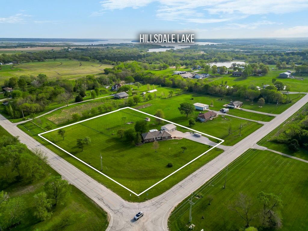 South on 169 Hwy to 255 Street Exit, west on 255th through Hillsdale and over Hillsdale Lake dam. Turn west on 271st, home is at the corner of 271st & Weaverly RD.