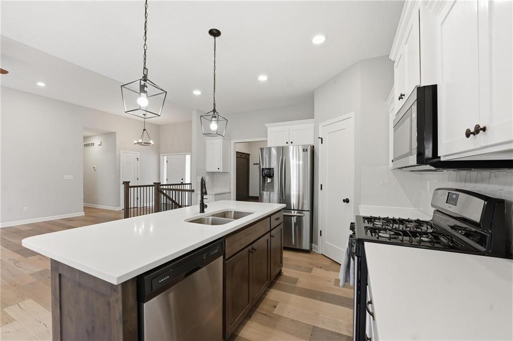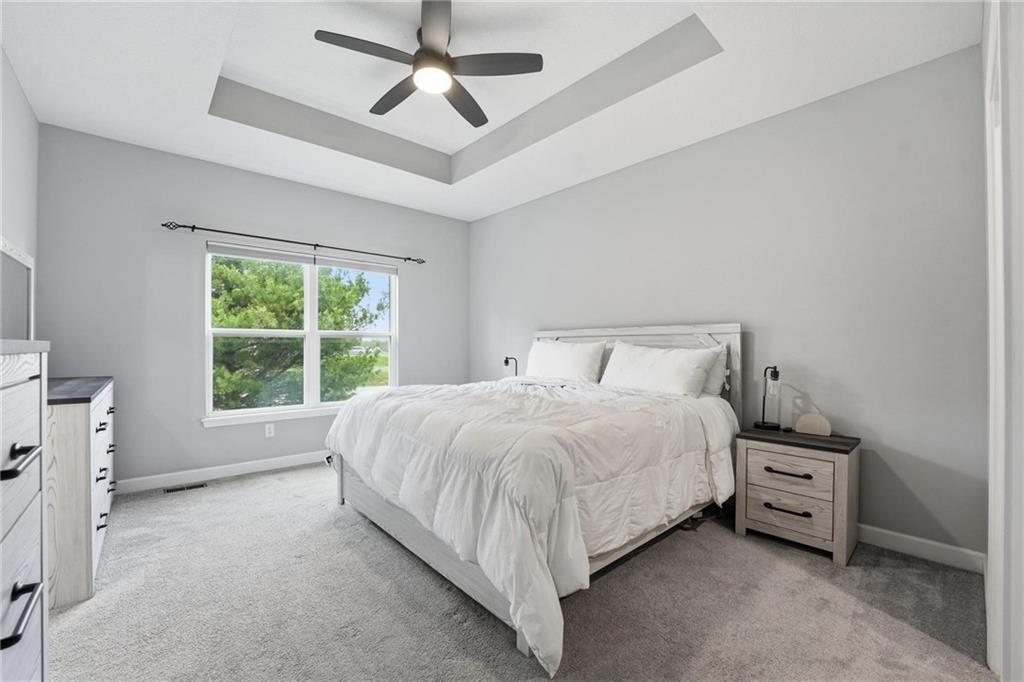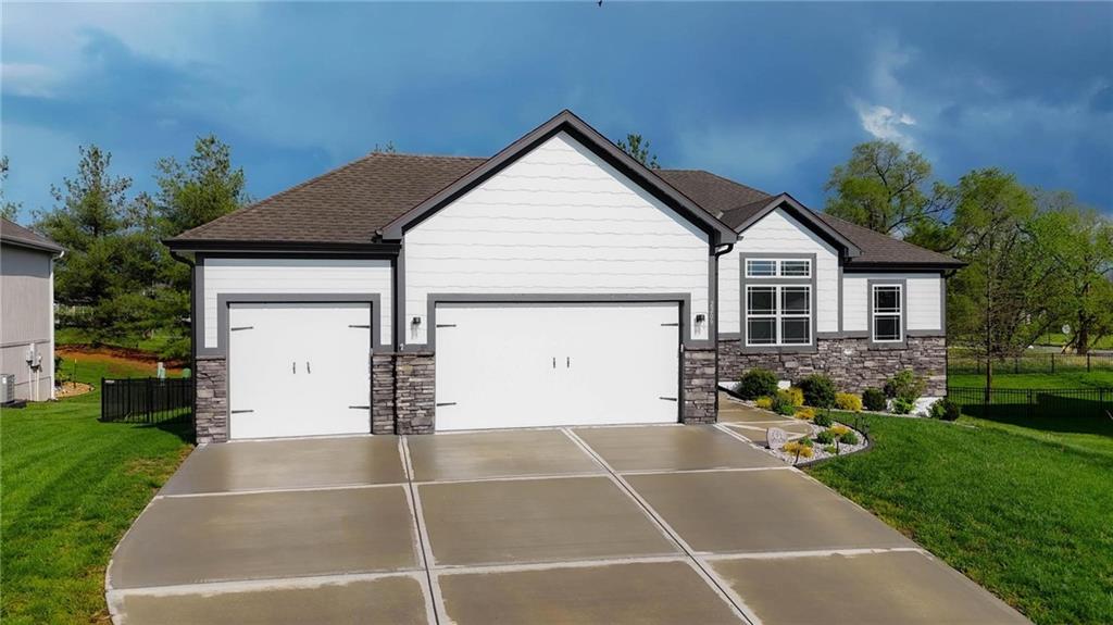 Welcome to 2209 Greenfield Court, a move-in-ready 5-bedroom home in The Meadows at Greenfield that allows you to skip the typical new construction to-do list and start enjoying your home from day one. As you walk in, you are greeted by an open layout filled with natural light and clean, modern finishes. The living room centers around a stone fireplace and flows seamlessly into the kitchen with granite counters, an island, and pantry, giving you a space that works just as well for everyday living as it does for hosting. Your main level primary suite provides a private retreat with a walk-in closet and a fully tiled walk-in shower. Two additional bedrooms and laundry on the main level give you the convenience of single-level living. The finished walk-out basement gives you flexibility with a large entertainment space, wet bar, projector setup, two additional bedrooms, a full bath, plus storage and a workshop area. Whether you need space for guests, hobbies, or everyday living, you have it here. Outside, you get more than just a backyard. You have a newly installed wrought iron fence that keeps the space open while adding security. You can enjoy evenings on the patio and fire pit area, and the added concrete pad gives you flexibility for a shed or additional use. The professionally landscaped flower beds with stone borders, decorative white and blue rock, and landscape lighting create a clean, finished look, while the color programmable permanent soffit lighting allows you to customize the exterior year-round. Inside and out, the details have already been handled for you, including blinds, a new fence and garage door openers saving you time and additional expense after closing. Located on a quiet cul-de-sac in a neighborhood with a community pool, walking trails, and fishing ponds, you also have convenient access to schools, parks, and highways.