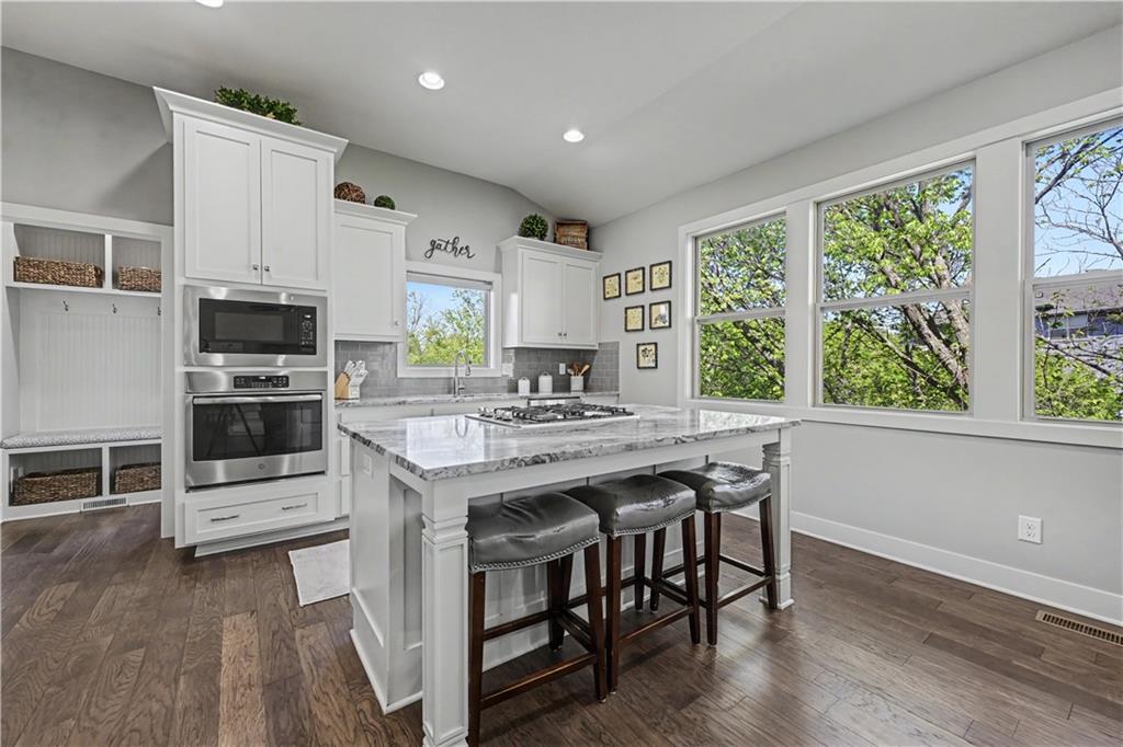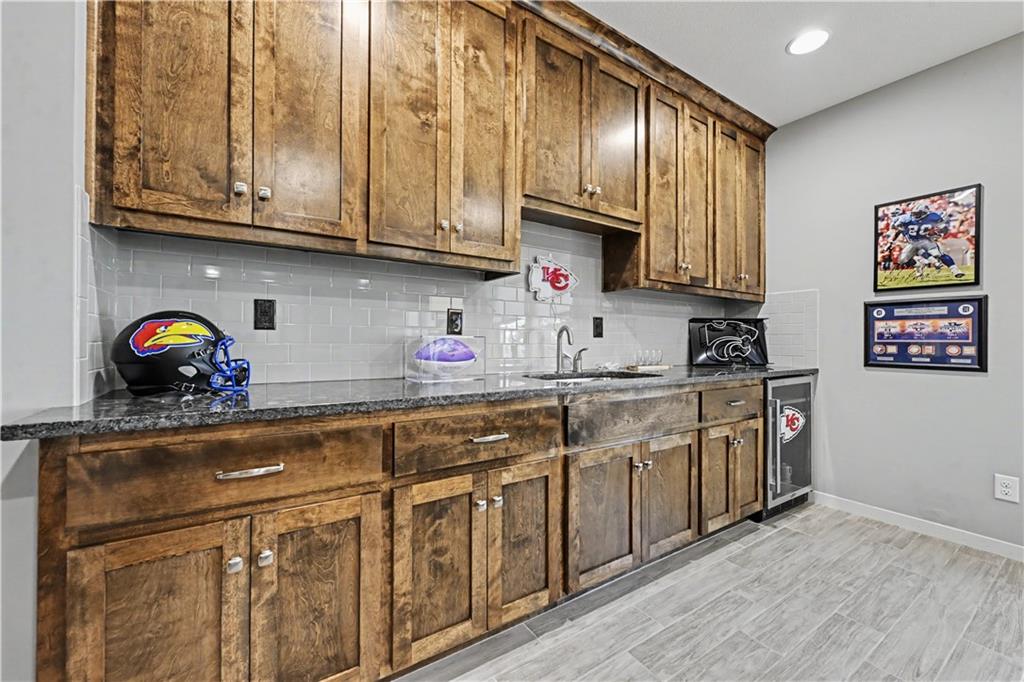 GORGEOUS reverse 1.5 story home on an amazing Cul De Sac in the heavily sought after Arbor Woods in Olathe with wonderful curb appeal! Beautiful gourmet kitchen with huge eat in granite island, with walk in pantry, hardwood floors, and stainless steel appliances. Lovely deck off conveniently located off kitchen - overlooking the beautiful treed view- great for grilling and entertaining! Spacious Master BR with ensuite with vaulted ceiling, carpet, shower, double vanities with granite tops, walk through closet, laundry and another bedroom/office all on main floor. Lower level has HUGE family room with wet bar, with third large bedroom with full bath, and large storage.