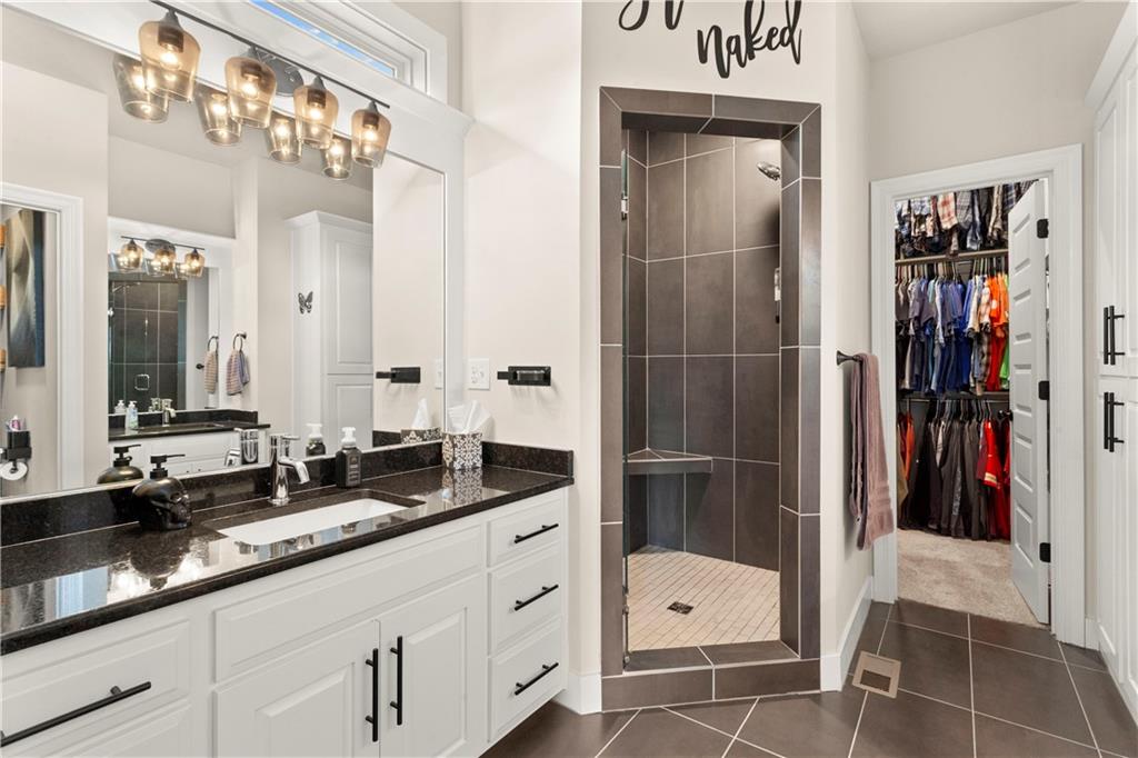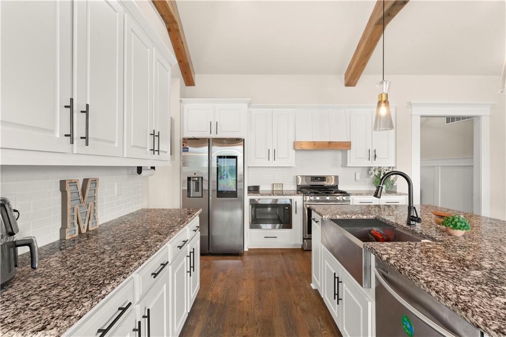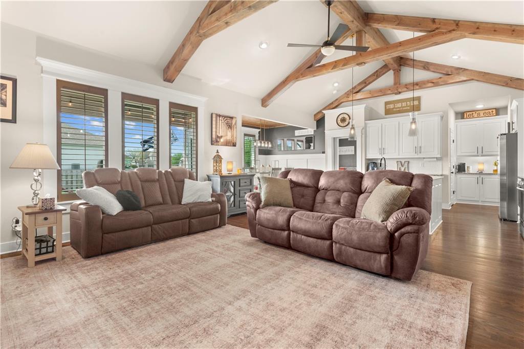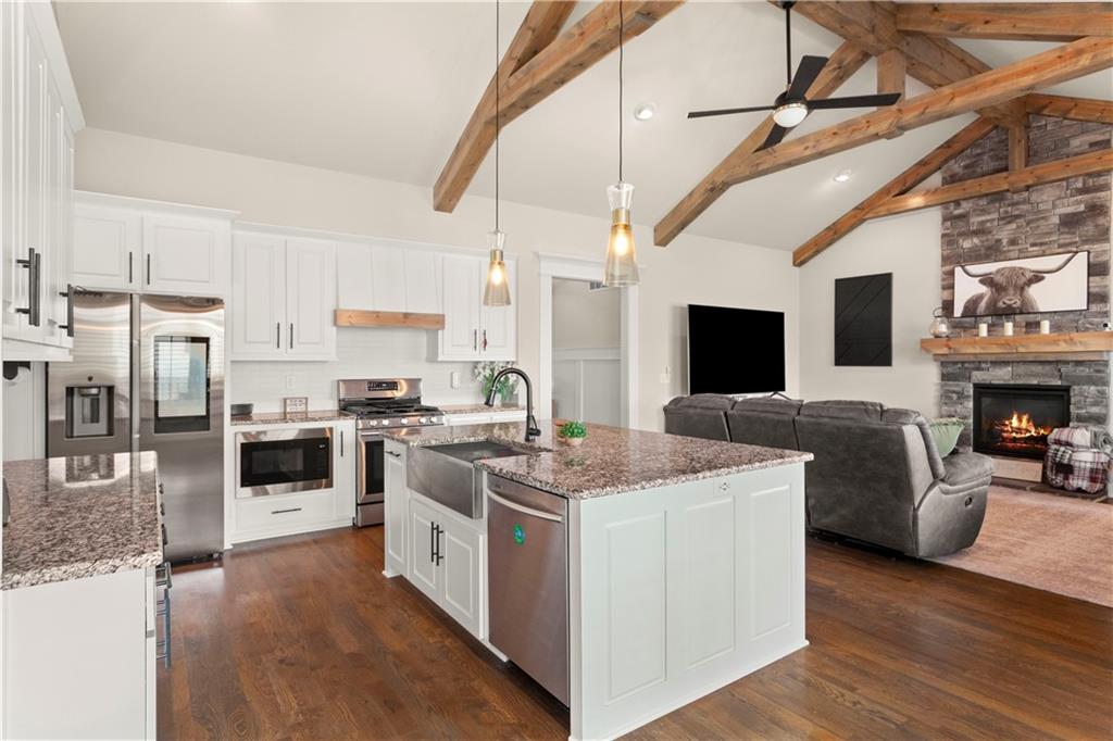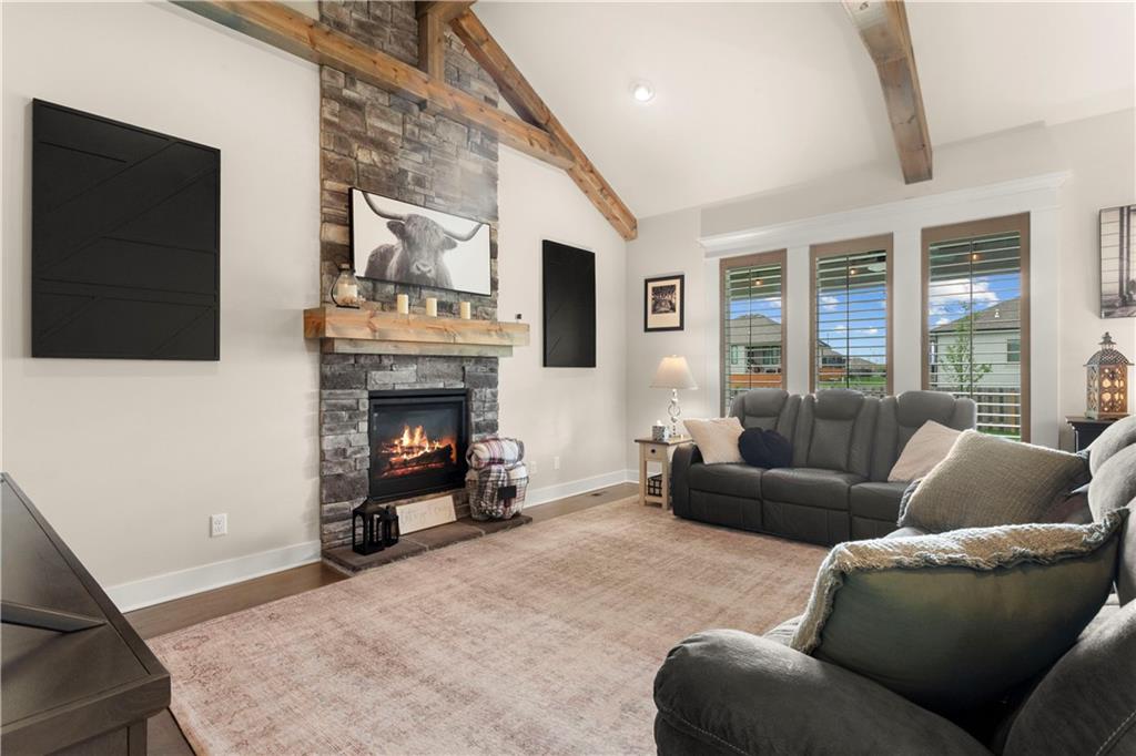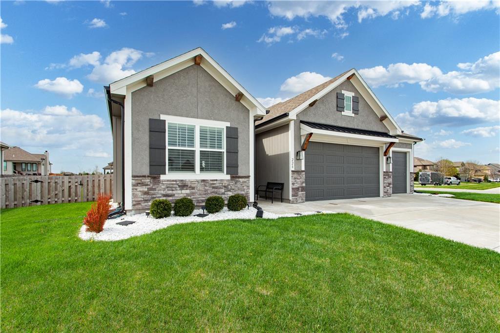 Step into this beautiful and spacious craftsman style ranch with upgrades that include magnificent wood beams, ceiling accents and stone fireplace. Epoxy floor in garage, also equipped with EV port. Plantation shutters throughout provide added privacy, sprinkler system, covered back patio and fenced yard backing to walking trail. Level and full 3 car driveway accesses 7' garage doors that can accommodate that big truck. Kitchen features pantry, granite island perfect for entertaining and seating, butler counter can accommodate a coffee bar. Hardwoods through living area and carpeted bedrooms. Primary bath has double vanity, walk in closet and double headed walk in shower. The expansive lower level has great potential and offers tons of daylight windows to build out additional bedrooms and living space. This home offers so much and has been very well maintained and cared for.