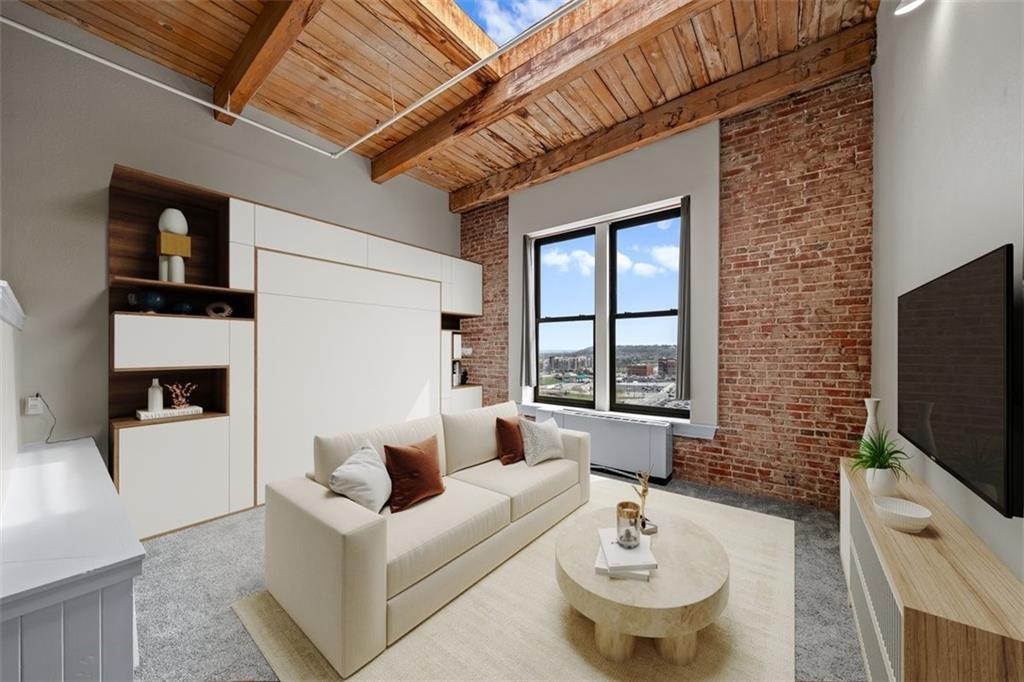 TOP FLOOR STUDIO with incredible skyline views. Welcome to your modern rustic escape above the city at the iconic Soho Lofts. This loft is the ultimate urban lifestyle, blending character, style, and not to mention the location into one unforgettable space. Step inside and you’re immediately greeted by soaring 15-foot ceilings and an abundance of natural light pouring in, creating an open, airy feel that instantly feels like home. The thoughtfully designed layout features a raised kitchen, exposed beams, and beautiful brick walls that bring warmth and texture throughout. Additional highlights include a skylight, all-electric living, and a versatile pull-out queen trundle bed, perfect for maximizing your space. Enjoy access to an impressive lineup of amenities, including a rooftop deck with stunning views, fitness center, sauna, club room, and multiple laundry facilities (one conveniently located on the 4th floor). Several amenities, including the gym, laundry, and club room are currently being renovated. Step outside and experience true convenience of local favorites like The Glam Room and The Phoenix Jazz Club, with easy access to the River Market, Crossroads District, Power & Light District, the highly anticipated Rock Island Bridge, and the KC Streetcar. Covered garage parking is available for lease through Denison Parking with direct building access, starting at $140/month, with additional nearby options available. Storage units may also be available through the HOA. Soho Lofts allow 30+ day rentals, making this not only a stunning place to live but also a strong investment opportunity. This is loft living at its finest, light, bright, full of character, and located in the heart of everything Kansas City has to offer.