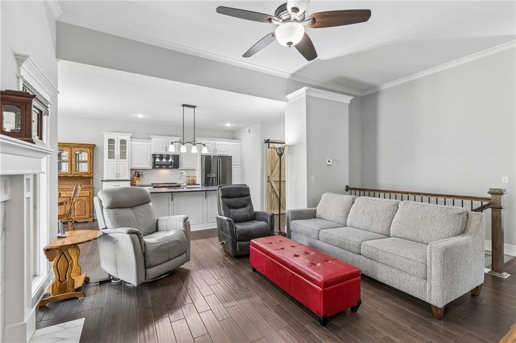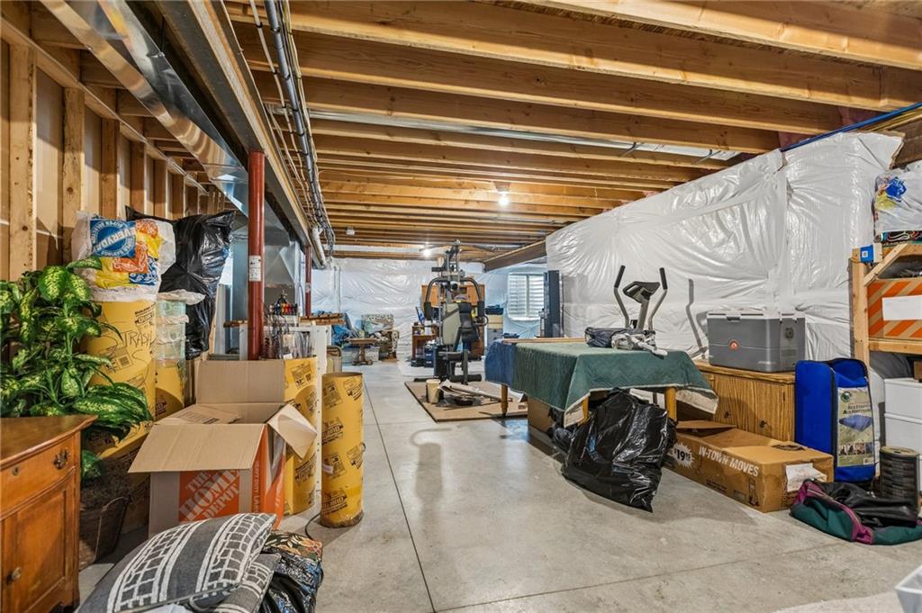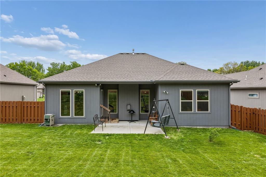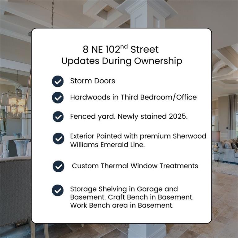 This beautiful Ranch home provides MAIN LEVEL living located in prime location with TOP RATED Staley High School! Wood floors throughout main living area & third bedroom/office. Open floorplan with eat-in kitchen that features a large center island, walk in pantry and lots of storage options. Primary suite offers a beautiful double vanity, separate tub and shower with nice walk-in closet. Covered patio off the kitchen to private fenced back yard. Spacious 3 car garage with built-in shelving and large work bench that stay. Huge unfinished basement with abundant versatile space & built-in storage shelves offers a ton of storage, room to add more living area and/or a 4th bedroom & add'l bath. Custom window treatments throughout home along with high energy efficiency HVAC & Gerken Thermopane windows. A super home with many extras!
