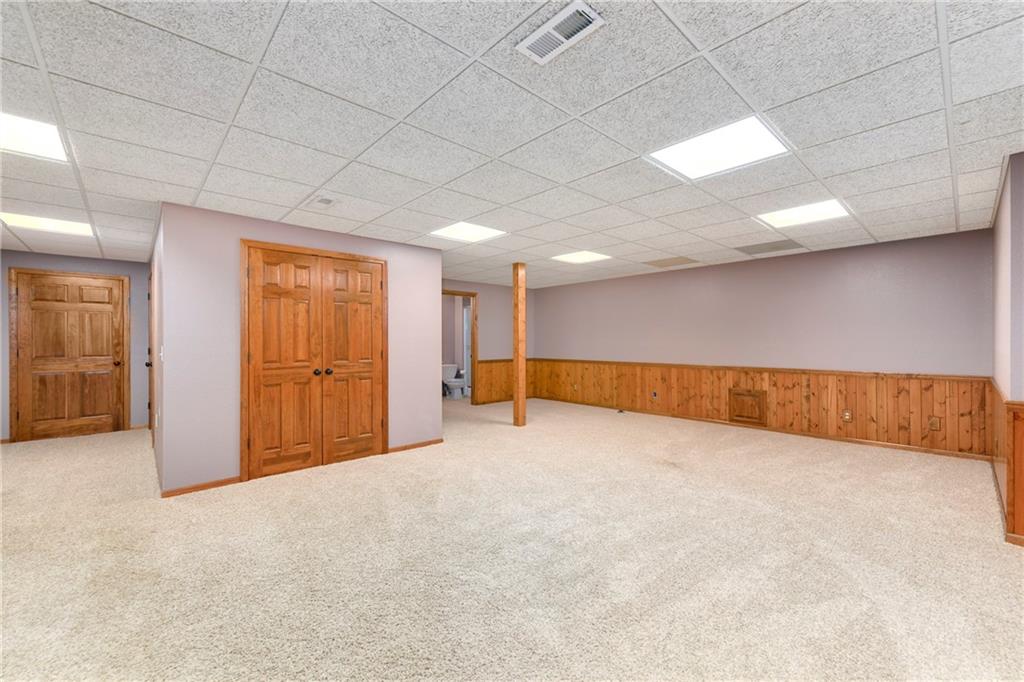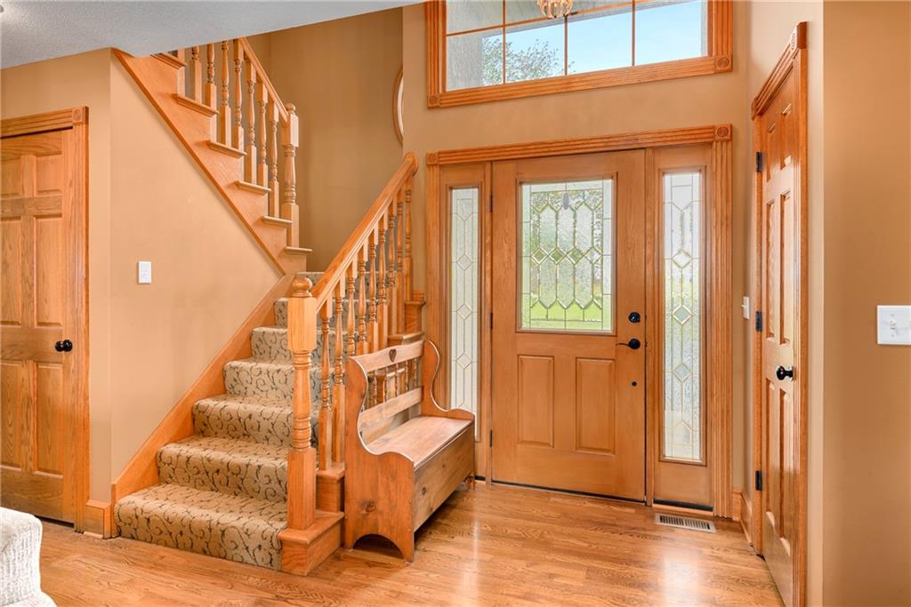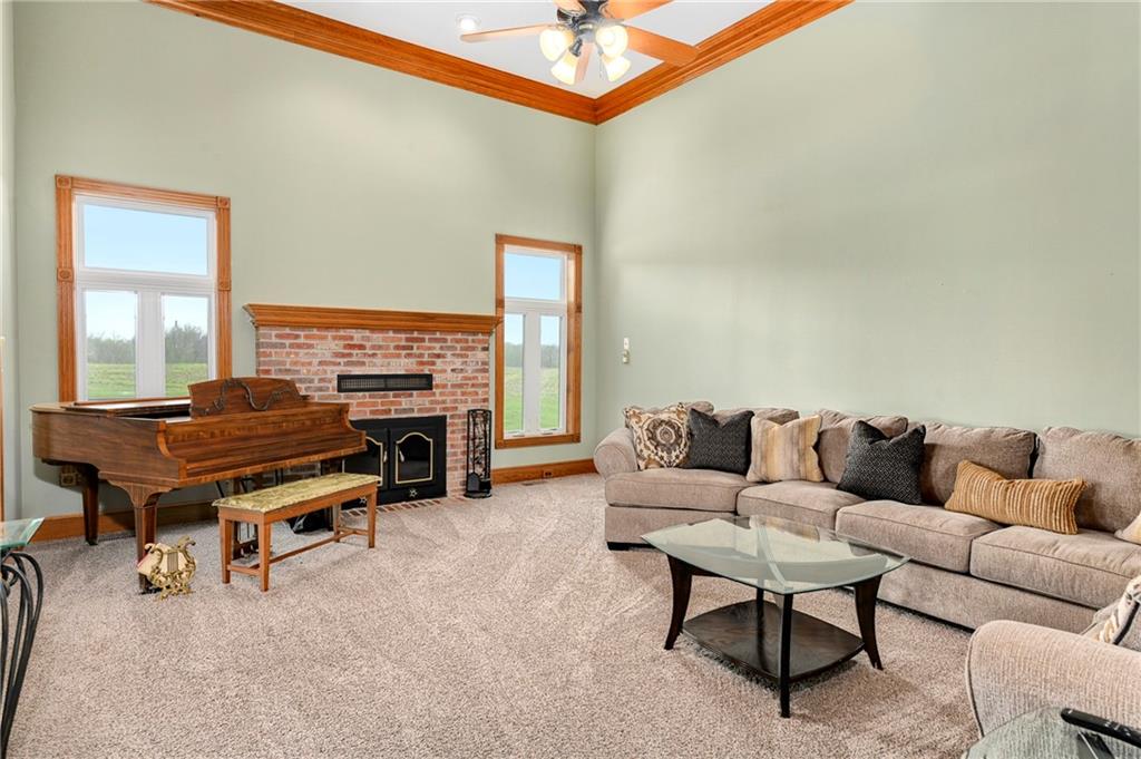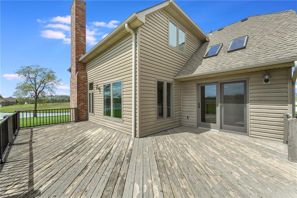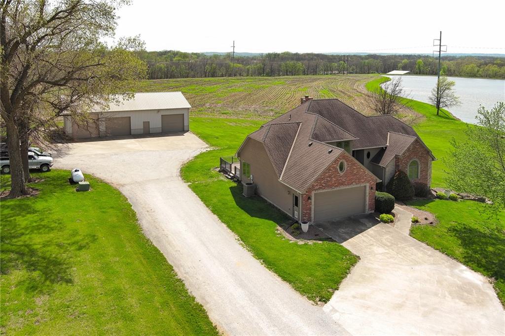 Escape to the peace of the countryside in this custom built home on 24 acres. A fully stocked pond with Bass, Crappies, Perch, Bluegill, and Catfish provides the perfect place to relax while watching the sun set. The entry opens to a large great room with heat circulating wood burning fireplace and 13' ceilings with beautiful crown moulding. There are two dining areas (one is currently being used as an office). The kitchen has many cabinets, pantry, island with cooktop, Granite countertops, tile backsplash, and wood floor. The primary suite is large and includes the following amenities - a double vanity, shower, whirlpool tub, linen closet, and walk-in closet. The two upstairs bedrooms are generous size with a shared bathroom. There is an office that could be converted into another bedroom/play area/craft room - the options are endless. There is a storage area above the garage off one of the bedrooms. The finished walk-out lower level has so much to offer with large family room, gym/exercise room (could be converted into a bedroom), full bath (with walk-in closet for guests), storage area (16.11x11.6), and 3rd car garage (14.3x11.2). The home was remodeled in 2008 with new vinyl siding, windows, roof, granite countertops, & refinished hardwood floors. The 60x40 outbuilding includes 100amp electrical service, insulated interior, concrete floor, water, radiant heat, pegboard/workbench, large overhead door for RV, & BONUS - 9,000 lb vehicle lift. There is a lean-to (40x12.6) on the back of the outbuilding. Located just a little under 10 minutes from I-70, this property offers the perfect balance of rural privacy and convenient access to town and Kansas City. Inspections welcome but selling "AS IS". The two gas tanks on the East side of the outbuilding are not staying.