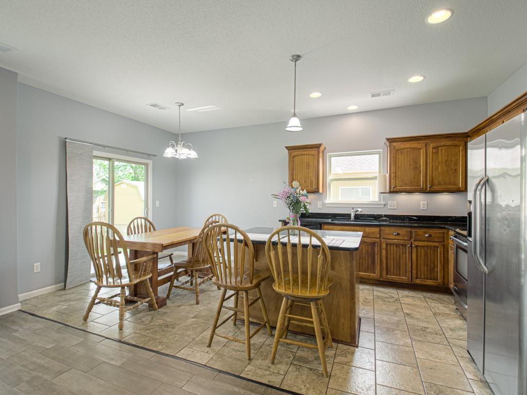 Beautiful true ranch home with an open, inviting layout. The spacious great room features a fireplace, ceiling fan, and abundant natural light. Ceramic tile flooring extends from the entry through the hallways, great room, kitchen, and both bathrooms. The kitchen offers granite countertops, a center island with breakfast bar, stainless steel appliances, and ceramic tile floors. Convenient main-floor laundry. The bedroom layout provides added privacy, with two secondary bedrooms on one side of the home and the primary suite on the other. The primary bedroom features a double-vault ceiling, ceiling fan, and a large walk-in closet. The primary bath includes a double vanity, jetted tub, and separate shower. Enjoy outdoor living with both a front patio and a large backyard patio. The backyard is fully enclosed with a wood privacy fence and includes a storage shed for extra space. Nicely landscaped yard in the front, back, and sides. Two-car attached garage with a three-car driveway.