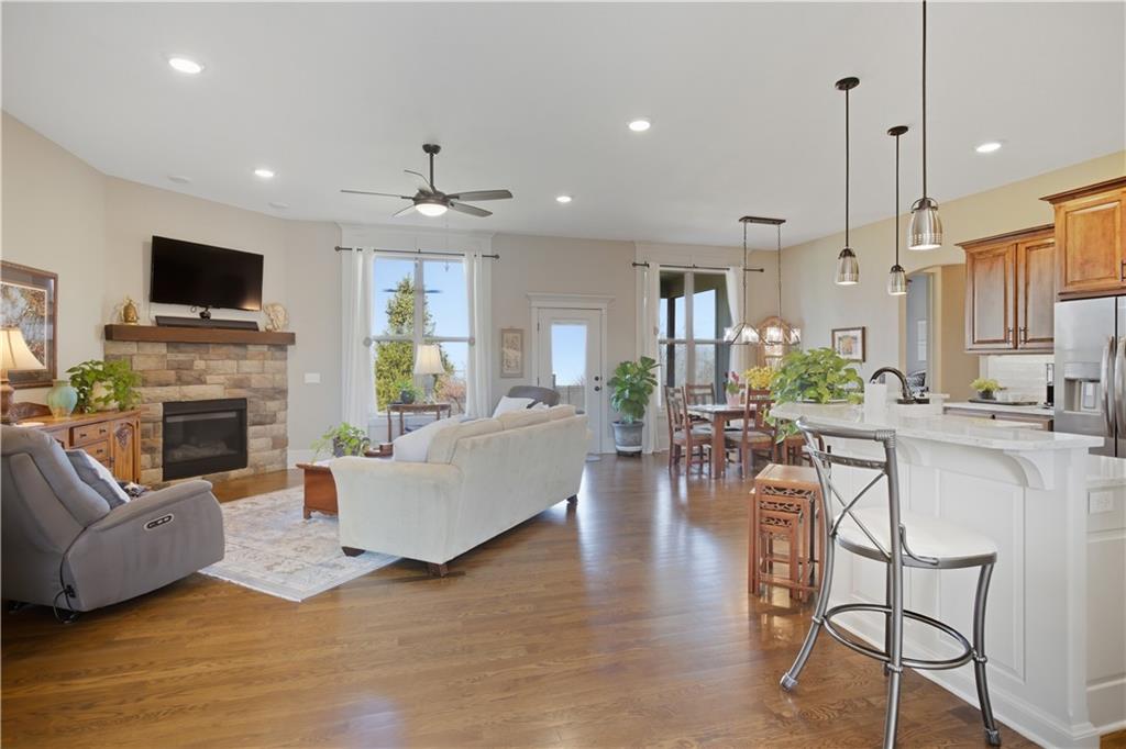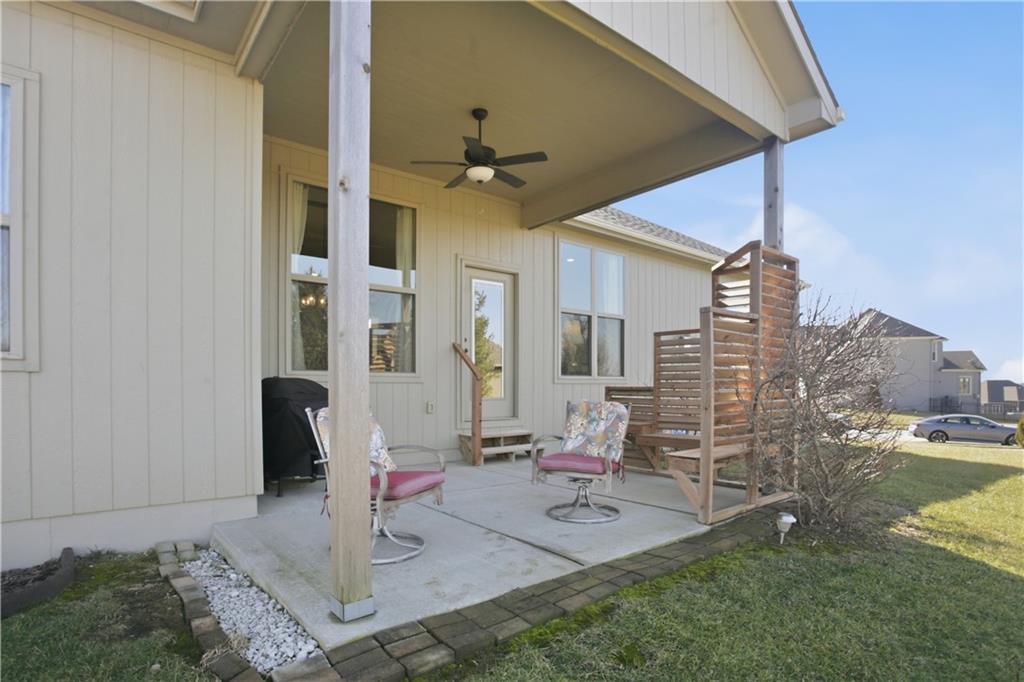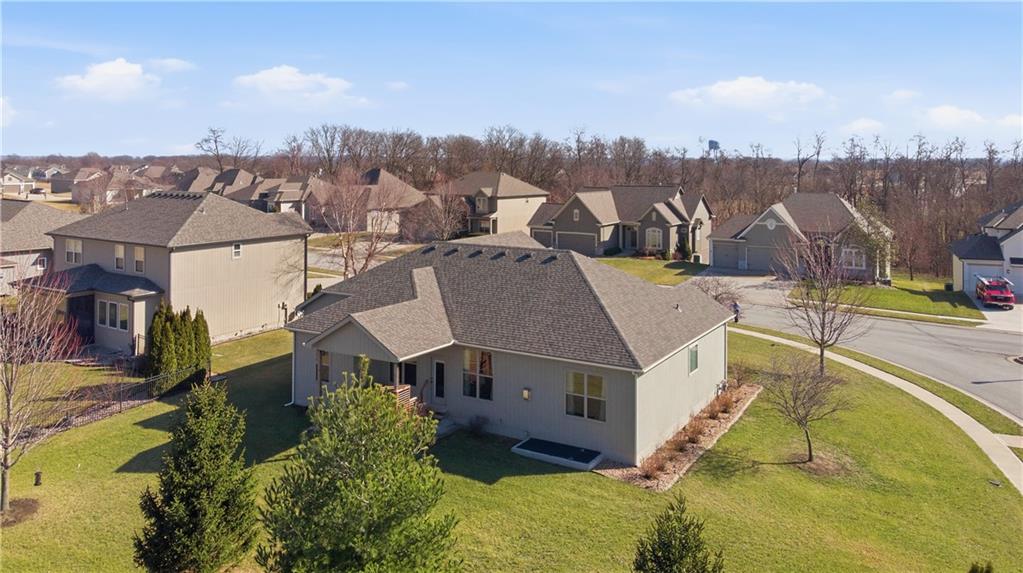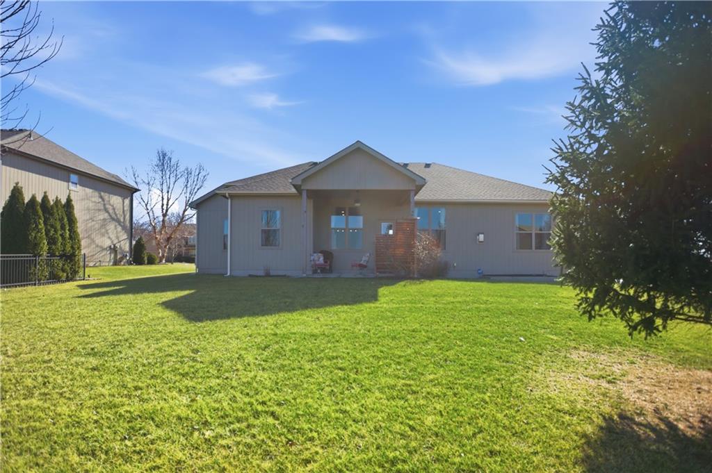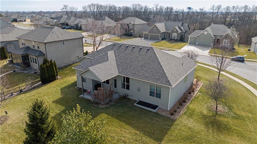 Former model home in highly desirable Greyhawke at the Lake! This spacious 4-bedroom, 3-bath residence offers an open and airy floor plan with tall 6-panel doors, large closets, and quality finishes throughout. The main level features three bedrooms, including a private primary suite with dual vanities, a jetted tub, a tiled glass walk-in shower, and a private water closet. Hardwood floors flow through the great room, dining area, and kitchen, and a gas fireplace anchors the living space perfect for both everyday living and entertaining. The finished daylight basement provides flexible space for recreation, guests, or hobbies. Step outside to enjoy the covered patio overlooking a beautifully landscaped corner lot that adjoins green space and includes an in ground sprinkler system. A security system and internal antenna streaming system are added bonuses. The three car attached garage offers plenty of room for vehicles, storage, or lake gear. Recent updates include a new roof and gutters for added peace of mind. Located just minutes from Smithville Lake and Paradise Pointe Golf Complex, with easy access to top-rated Smithville schools and Northland amenities, this home delivers space, comfort, and an unbeatable location.