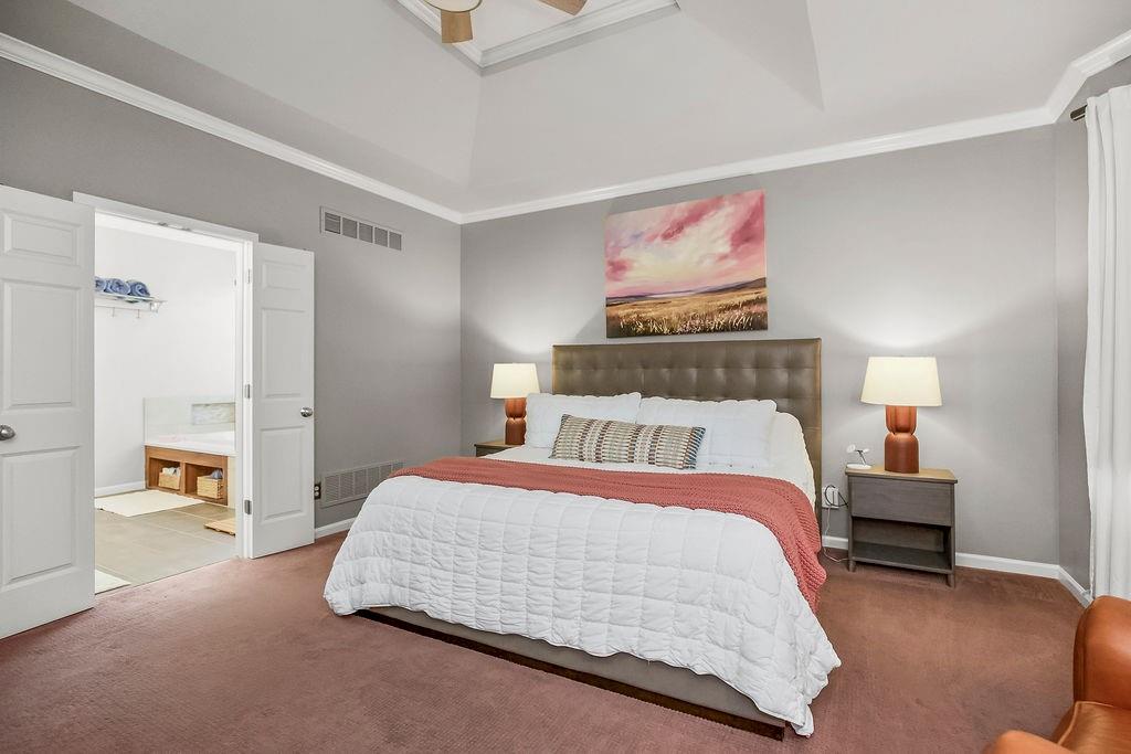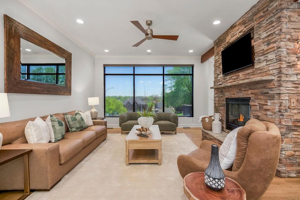Welcome to this stunning and spacious 1.5-story home designed for both comfort and entertaining! The custom gourmet kitchen is a chef’s delight, boasting top-of-the-line Viking appliances, a gas range, and a generous island perfect for meal prep and casual gatherings. Step outside to your private retreat featuring an outdoor kitchen and a cozy fire pit—ideal for relaxing or entertaining year-round. Inside, the main level impresses with a formal dining room, a bright great room with expansive windows and a see-through fireplace, a private office, and a luxurious primary suite. Upstairs, you’ll find three spacious bedrooms and a versatile loft area—perfect for a playroom, reading nook, or extra workspace. The finished walkout lower level offers even more room to enjoy, including a family room, wet bar, rec area, and an exercise room. Nestled on a quiet cul-de-sac with a fenced yard and easy lake access, this home combines privacy, elegance, and convenience. A backyard gate leads directly to the sidewalk and dock, just steps away. This home truly has it all—style, space, and a perfect setting for everyday living or entertaining!