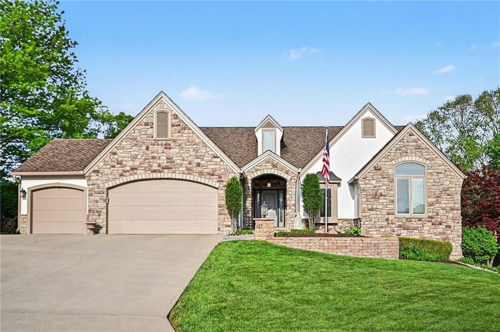 Located near the Lawrence Country Club, this expansive and beautifully maintained home offers exceptional space, updates and comfort throughout. The welcoming hardwood entry opens to an office with French doors. The spacious living room features gleaming hardwoods, a vaulted ceiling and a cozy fireplace. The oversized kitchen is a chef's dream-with quartz countertops, custom cabinetry, under-cabinet lighting, a gas range, built-in microwave, wine fridge and hardwood floors. There is an enclosed sunroom complete with ceiling fan, split heat/air and a nice doggie door. The main-level primary suite is spacious, has a massive walk-in closet and a wonderful, updated bathroom with a huge walk-in shower, custom cabinets and gorgeous tile flooring. A second main-floor bedroom has lots of room. There is a full bathroom in the hall with a wonderful skylight. There is a main floor laundry room as well as a laundry area in the lower level. The upstairs has two large bedrooms. The third bedroom has a large walk-in closet and beautiful plantation shutters. The fourth bedroom also boasts a nice walk-in closet. There is a bathroom on the second level that has a wonderful step-in shower. The lower-level walkout basement offers luxury vinyl flooring, a secondary kitchen with a huge island, sink and custom-built cabinets. The fifth bedroom is absolutely enormous with a large walk-in closet. There is a full bathroom in the lower level which makes this area perfect for guests or extended living. The lower-level walks out to a large patio. The big backyard has a gorgeous stone patio, pergola and a nice firepit. This home has beautiful landscaping, stone walkway in the front and a three-car garage. This stunning home combines abundant living space, quality craftsmanship, and a prime location near golf, trails, shops, schools and more. This is an ideal blend of luxury and comfort. Taxes and rooms sizes are approximate. Buyer to confirm schools and any information they deem important.