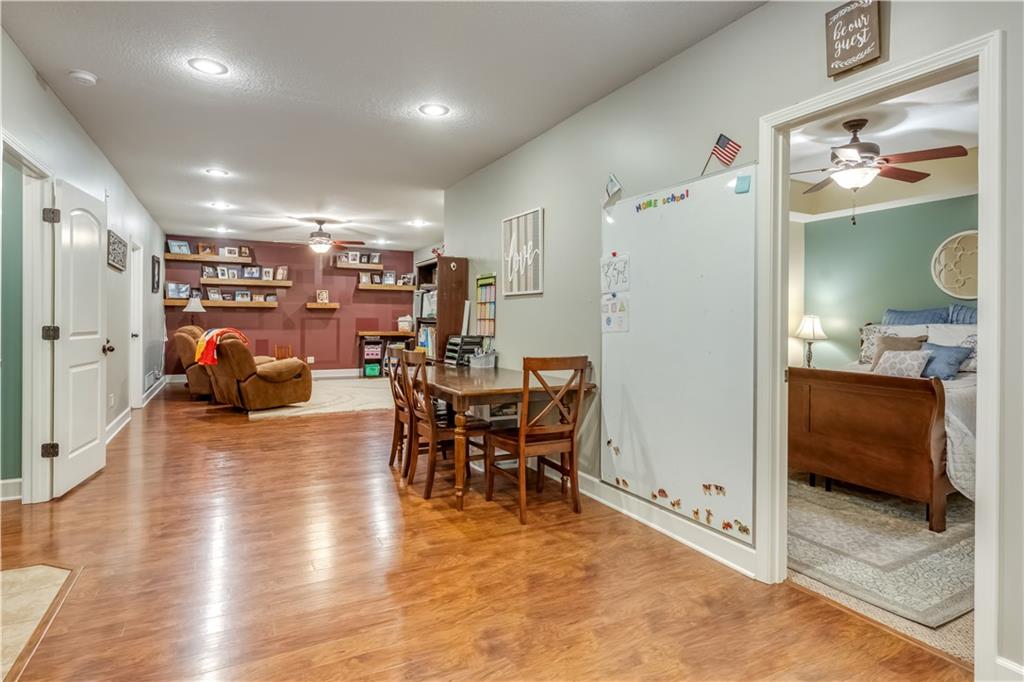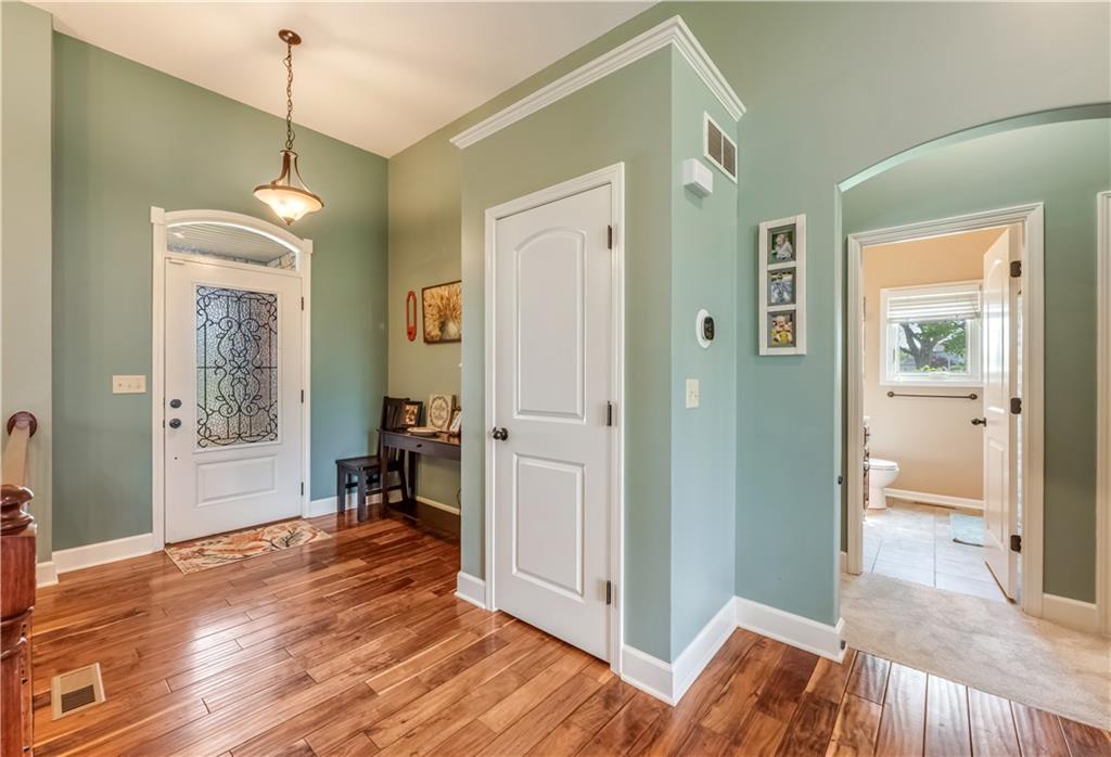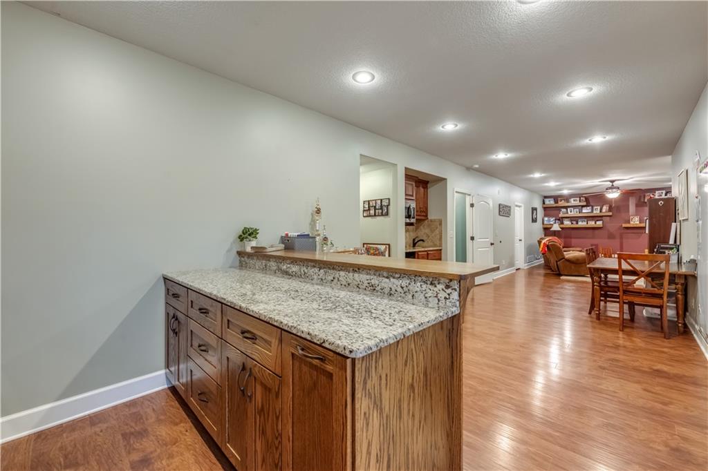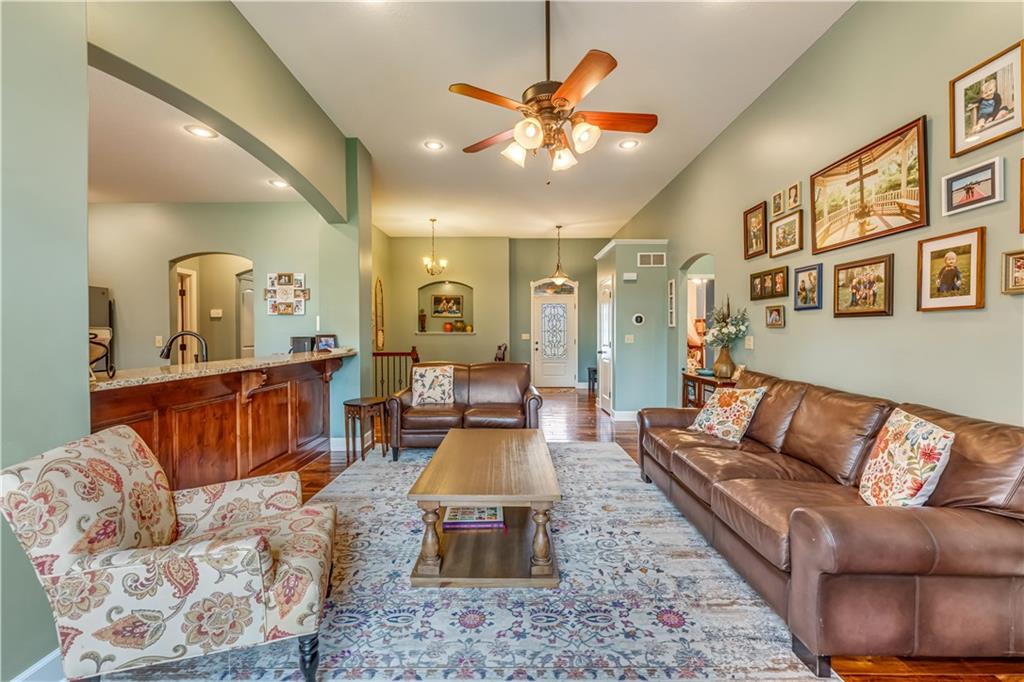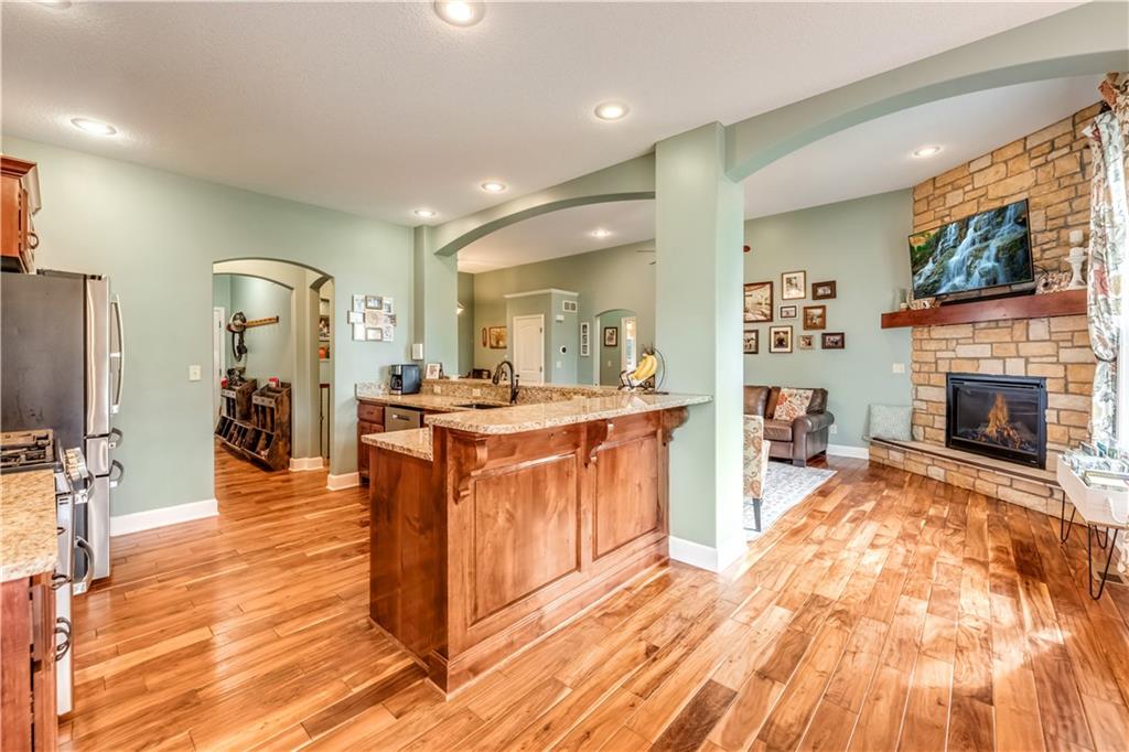 Your beautiful home is ready for you in the desirable Cayhill subdivision, known for holiday events, walkability, and commuting convenience to Whiteman AFB! This immaculate reverse ranch sits on a large corner lot with subdivision lake privileges, just minutes to shopping and restaurants in town. The welcoming front porch ushers you into warm hardwood hand-scraped floors and an open concept great room with tall ceilings. Enjoy the warmth of the gas fireplace with stone surround and still have connection to the Kitchen/Dining Room activities. Sellers have increased energy efficiency with window replacement in LR, DR, back secondary Bedroom, and hall Bathroom June 2025. Your large Kitchen has an abundance of custom wood cabinetry, granite counters, stainless steel appliances that all stay (Fridge, double oven, and dishwasher less than a year old!) and a dedicated pantry directly off the Kitchen. Main floor laundry is also nearby. The generous Primary Bedroom showcases a walk-in closet, newer carpet, and a beautifully updated on-suite Bathroom with new floor tile, newly tiled shower, new glass door, double vanity, and jetted tub. The two secondary Bedrooms have larger closets with storage systems and newer carpet with the hall Bathroom between. The lower level includes a full bar (drink fridge will stay) and service area off of the spacious Family Room, the 4th true Bedroom with a walk-in closet, another nonconforming room for many uses, and a 3rd full Bathroom. The 300 SF storage area includes a utility sink, storm shelter, NEW AC and furnace in 2025! Head out the patio door upstairs to the screened-in deck for relaxation without bugs! The basement patio leads up to the wide, newly stained back deck with a dedicated gas line for a firepit or grill. Play options abound with a swing-set and more in the fenced yard with in-ground sprinkler system. Come make new memories here!