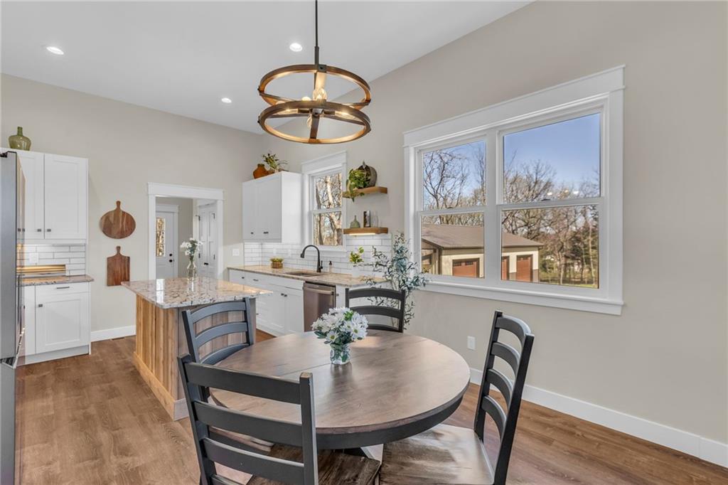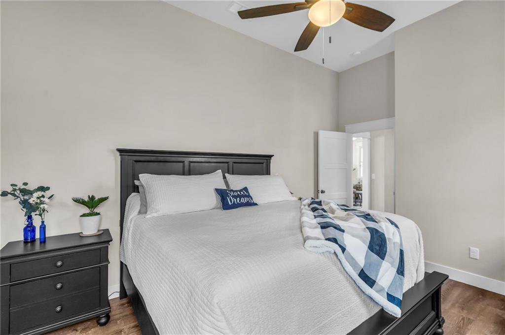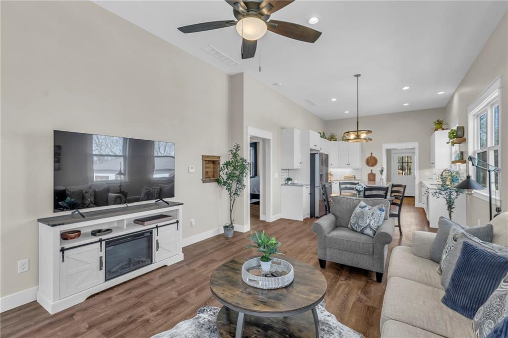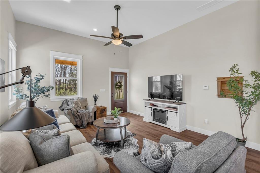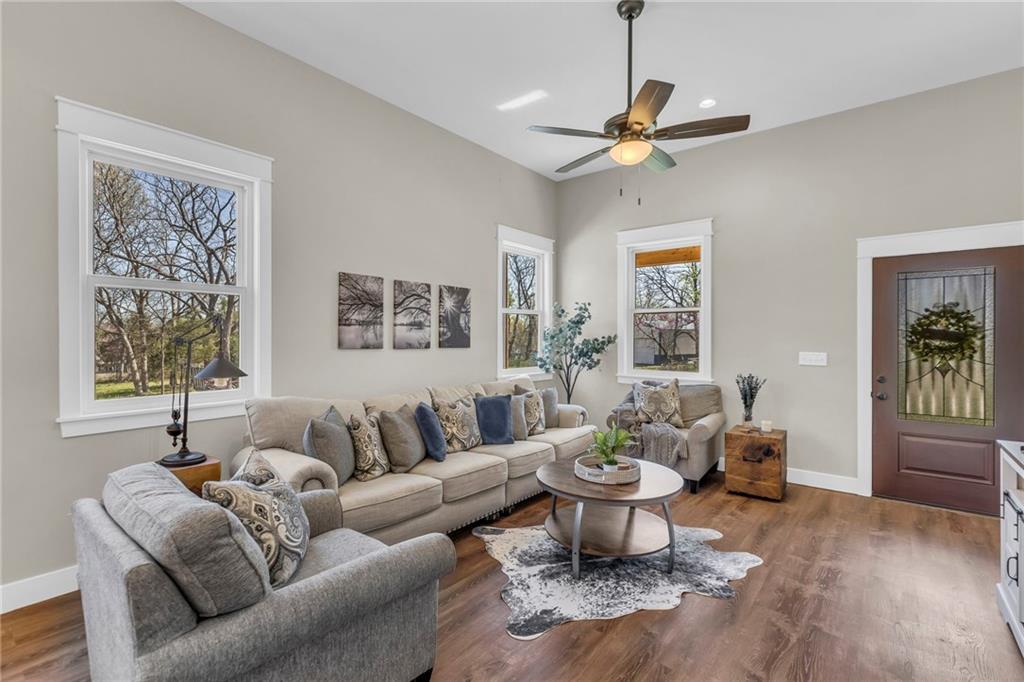 Step into a world of modern luxury and thoughtful design in this stunning two-bedroom, two-bathroom sanctuary, with a private office in back, with its own dedicated entrance, perfect for an at-home business. An inviting front porch welcomes you into a bright, airy open floor plan defined by soaring 11-foot ceilings and elegant, durable luxury vinyl plank flooring that flows seamlessly throughout. The gourmet kitchen serves as a contemporary culinary hub, boasting tall cabinetry with soft-close hardware, sleek quartz countertops, and premium stainless-steel appliances. Retreat to the tranquil master suite, highlighted by a stylish accent wall and a spa-like ensuite featuring a beautifully tiled shower, double vanities, and a generous walk-in closet. Practicality meets comfort with a conveniently located laundry room and an on-demand water heater for instant warmth. Beyond the main living areas, you will find a lovely covered back deck that overlooks a serene wooded backdrop. The property includes the adjacent lot at 93 Enchanted Lane and a large outbuilding equipped with three overhead doors, concrete floors, electricity, and a built-in storm shelter, providing the perfect space for hobbies or enjoying the local wildlife from the shade of the overhang. Mechanically sound with 200-amp service, city sewer, and plumbing ready for future rural water connection. There is an option to purchase the home without the building and the extra lot. This home is just a 3 minute walk from the "Big Lake," with access to swimming, and lots of lake fun! Residents also enjoy a wealth of community amenities, from golf courses and swimming pools to hiking trails and a clubhouse. This is an incredible opportunity to embrace a move-in-ready lifestyle that perfectly balances quiet lakeside solitude with exciting recreational opportunities.