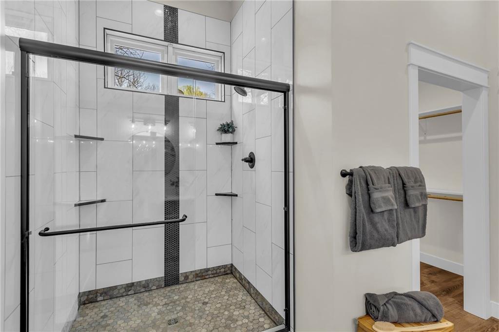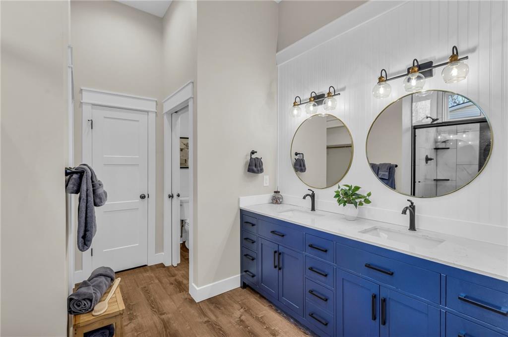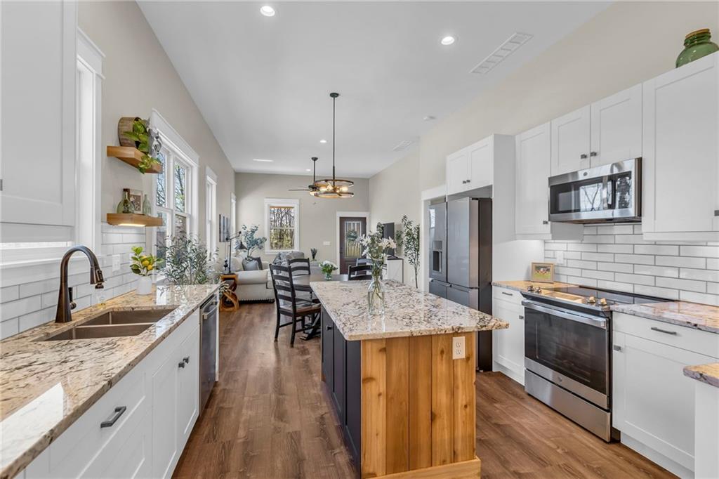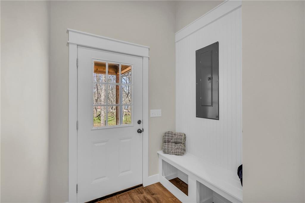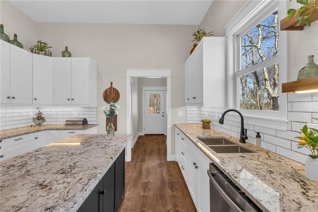 Step into a world of modern luxury and thoughtful design in this stunning two-bedroom, two-bathroom sanctuary, with a private office in back, with its own dedicated entrance, perfect for an at-home business. An inviting front porch welcomes you into a bright, airy open floor plan defined by soaring 11-foot ceilings and elegant, durable luxury vinyl plank flooring that flows seamlessly throughout. The gourmet kitchen serves as a contemporary culinary hub, boasting tall cabinetry with soft-close hardware, sleek quartz countertops, and premium stainless-steel appliances. Retreat to the tranquil master suite, highlighted by a stylish accent wall and a spa-like ensuite featuring a beautifully tiled shower, double vanities, and a generous walk-in closet. Practicality meets comfort with a conveniently located laundry room and an on-demand water heater for instant warmth. Beyond the main living areas, you will find a lovely covered back deck that overlooks a serene wooded backdrop. The property includes the adjacent lot at 93 Enchanted Lane and a large outbuilding equipped with three overhead doors, concrete floors, electricity, and a built-in storm shelter, providing the perfect space for hobbies or enjoying the local wildlife from the shade of the overhang. Mechanically sound with 200-amp service, city sewer, and plumbing ready for future rural water connection. There is an option to purchase the home without the building and the extra lot. This home is just a 3 minute walk from the "Big Lake," with access to swimming, and lots of lake fun! Residents also enjoy a wealth of community amenities, from golf courses and swimming pools to hiking trails and a clubhouse. This is an incredible opportunity to embrace a move-in-ready lifestyle that perfectly balances quiet lakeside solitude with exciting recreational opportunities.