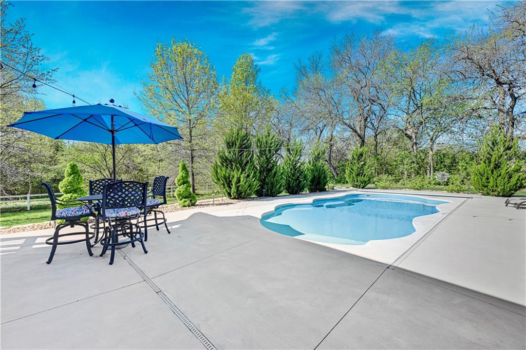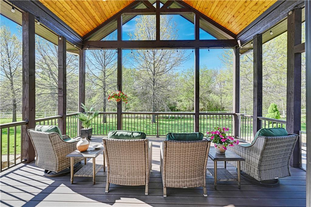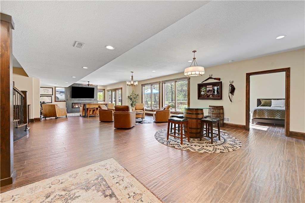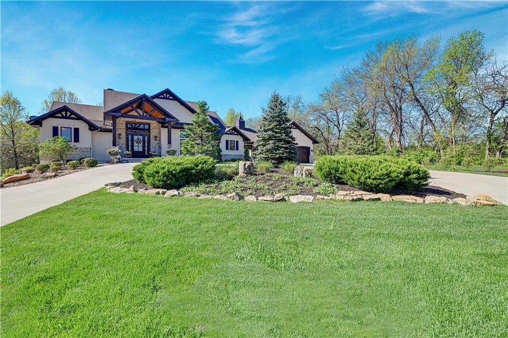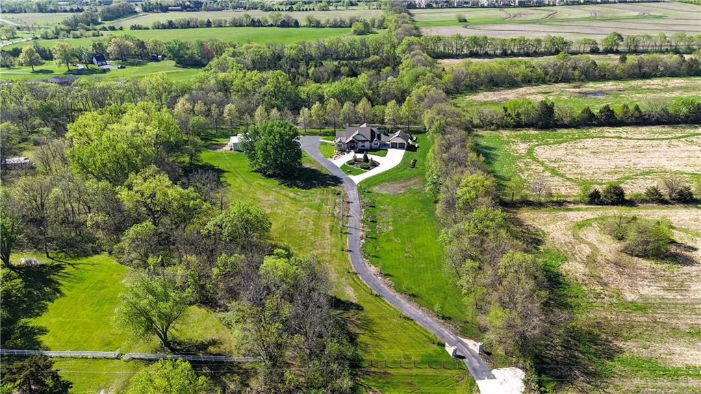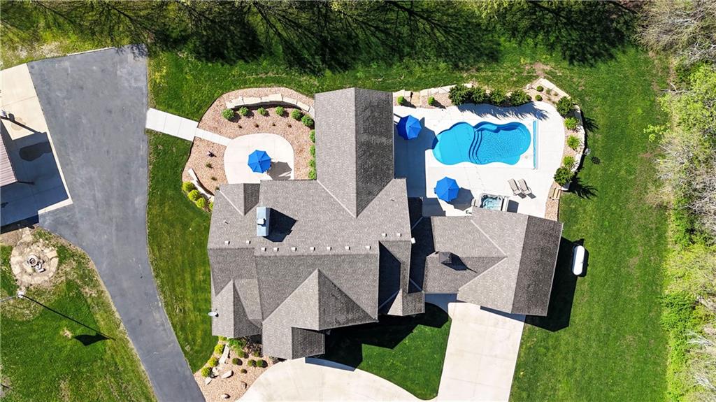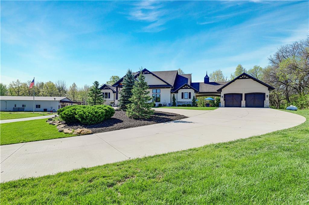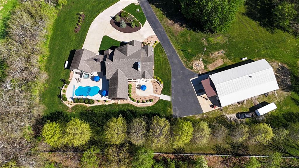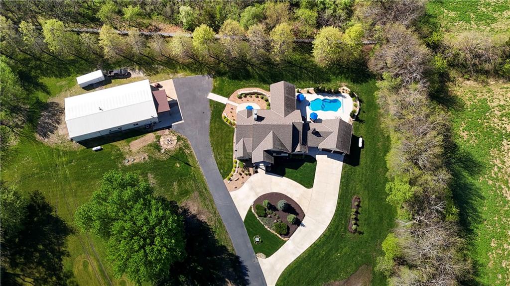 Welcome to this stunning custom reverse 1.5-story estate, perfectly situated on nearly 8 acres of picturesque land. Thoughtfully designed with both luxury and functionality in mind, this home offers an exceptional blend of refined interior spaces and resort-style outdoor living. The main level features a chef’s designer kitchen with high-end finishes and ample space for entertaining, flowing seamlessly into a breathtaking great room highlighted by soaring vaulted ceilings and striking wood beams. The primary suite is a true retreat, complete with a cozy fireplace and a spa-like atmosphere. A dedicated office with an attached full bath provides flexibility for work or guest accommodations. The finished lower level is ideal for entertaining or multi-generational living, boasting a spacious family/media room, multiple seating areas, a wet bar/kitchenette, two additional bedrooms, and two full bathrooms. Step outside to your private oasis, where you’ll find an incredible outdoor living area featuring a fully equipped outdoor kitchen, an in-ground pool, a covered deck, and an expansive patio—perfect for relaxing or hosting gatherings. An additional outbuilding adds versatility and storage options to this already impressive property. This rare offering combines privacy, luxury, and space—creating the perfect place to call home.