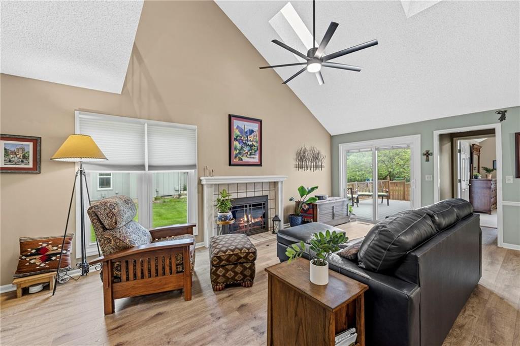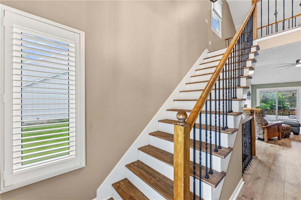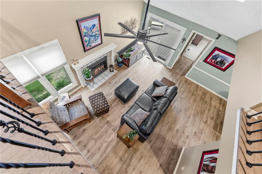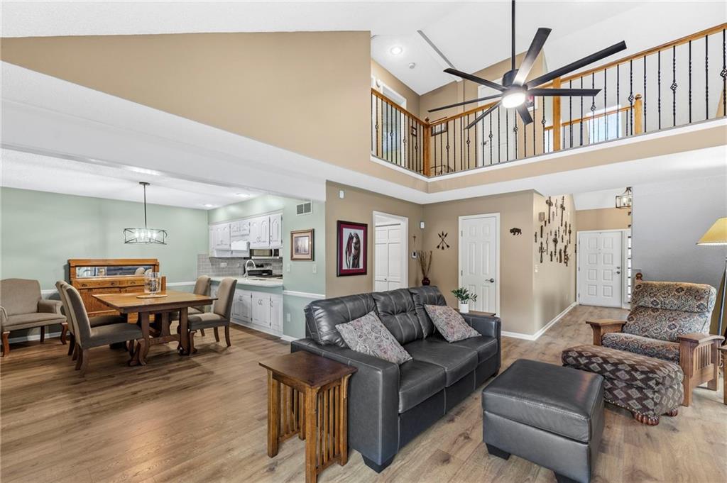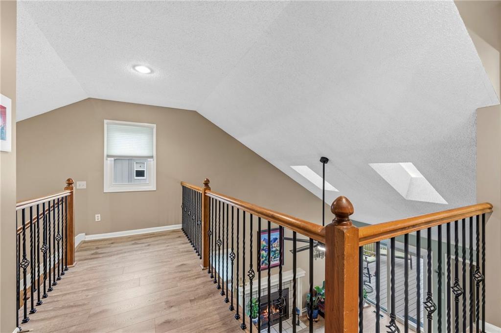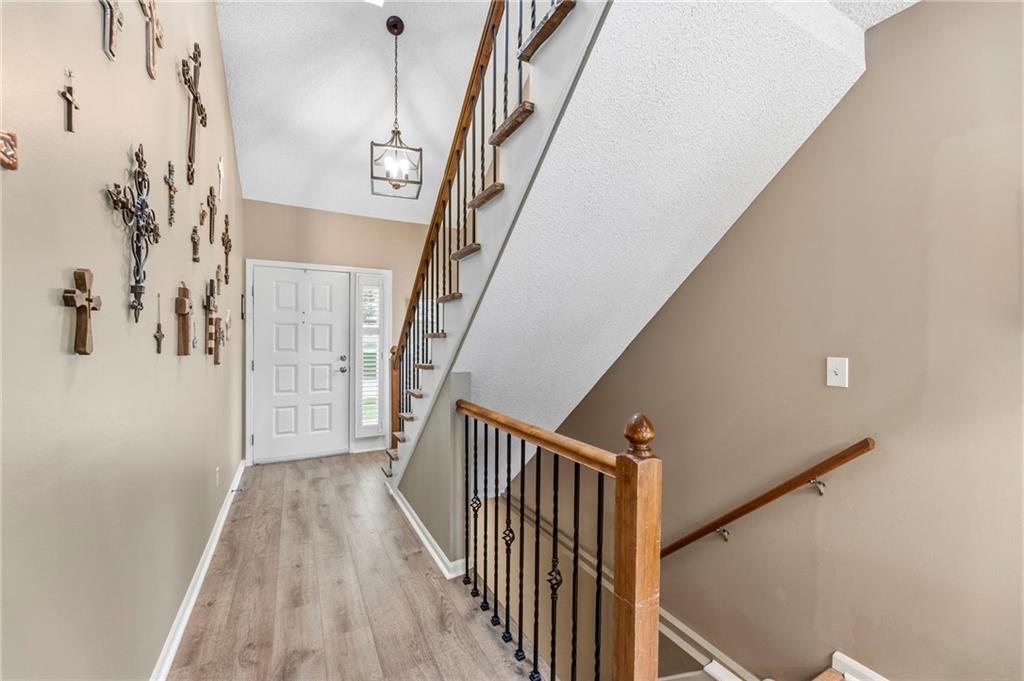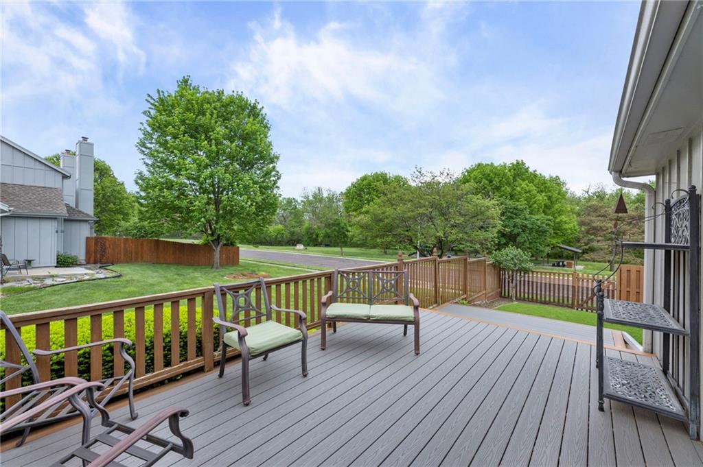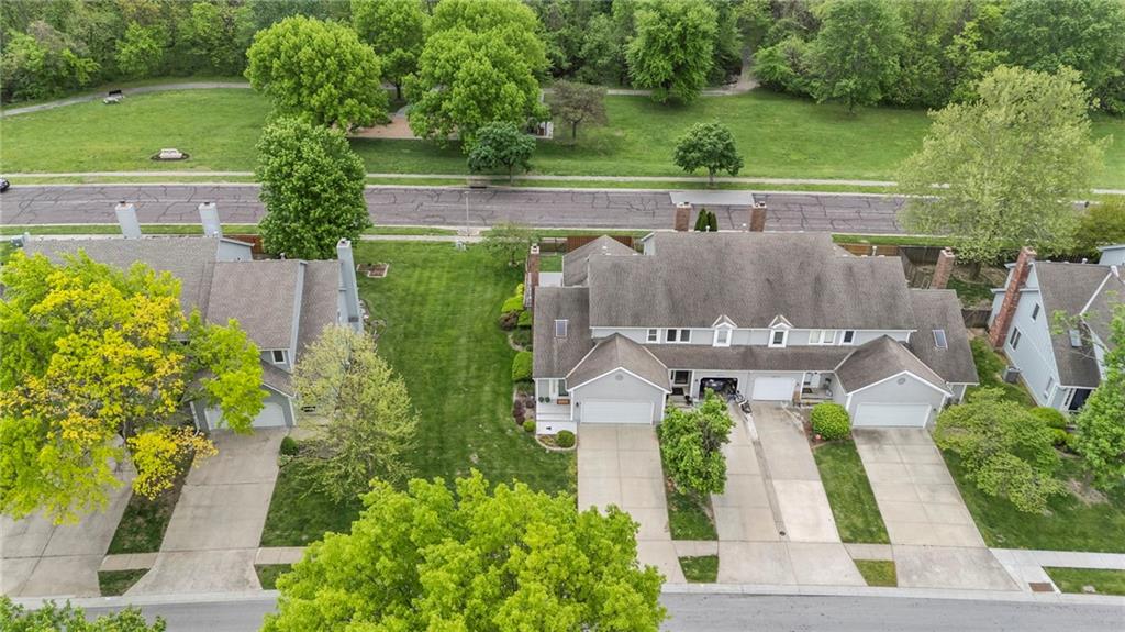 This maintenance-provided gem in the coveted Blue Valley School district combines comfort, convenience, and a truly desirable setting backing to Cross Creek Park and its scenic walking trails. A rare main-floor primary suite offers ease of living, complete with a relaxing whirlpool tub, while the fenced backyard and composite deck create the perfect space to unwind or entertain with a view. Lawn service will mow inside the fence if gate is unlocked! Inside, you’ll find gorgeous hardwood floors, soaring ceilings in the living room, and a stunning fireplace that anchors the space beautifully. The updated kitchen with modern countertops adds both style and functionality. Upstairs has two spacious bedrooms and a full bath, centered around a bright, open landing. The finished basement expands your living space with a dedicated office and built-in shelving—ideal for work or hobbies. Meticulously maintained and move-in ready, this home also includes a Platinum Home Warranty from Old Republic for added peace of mind.