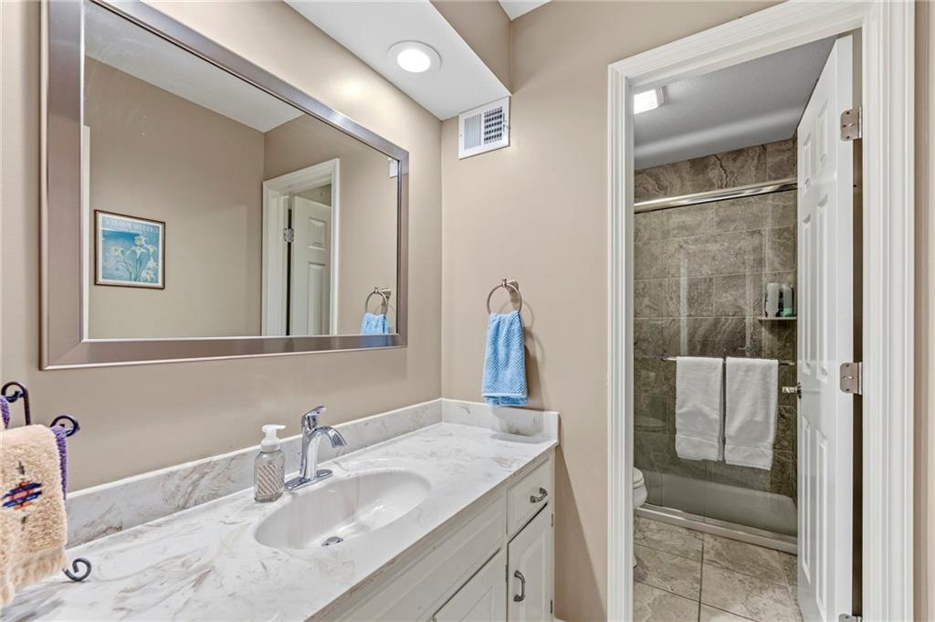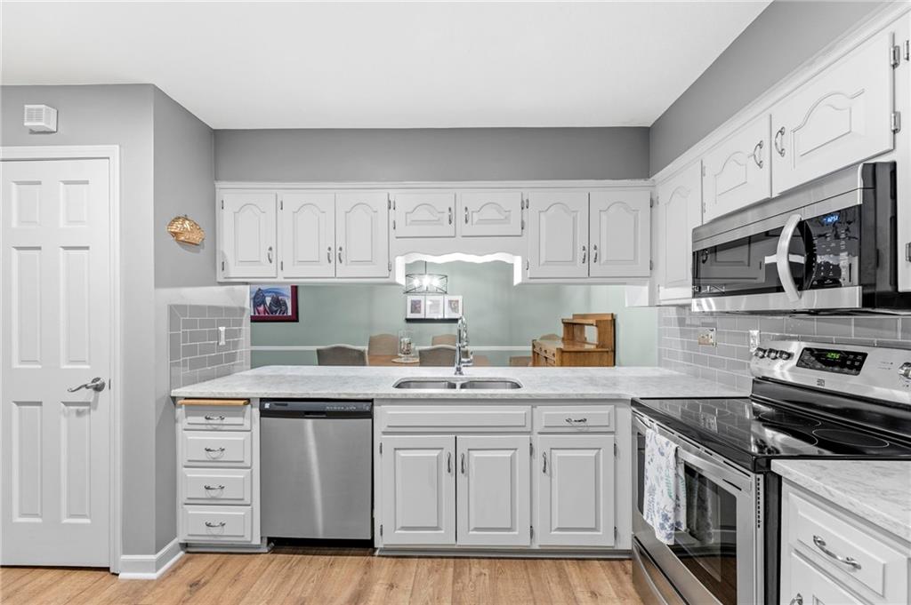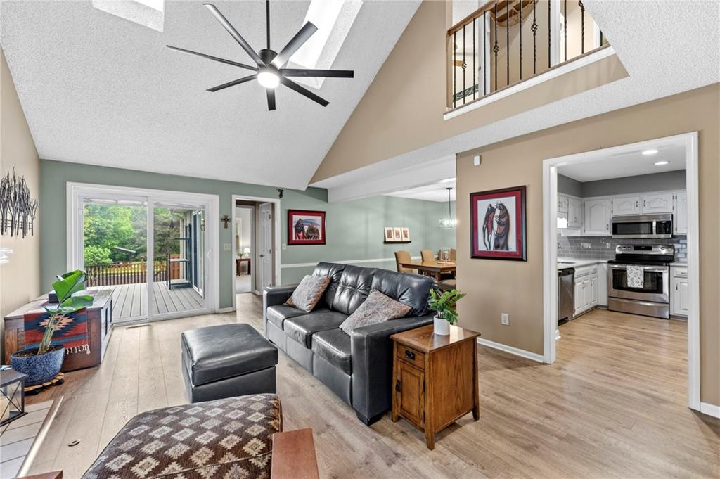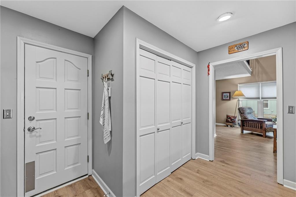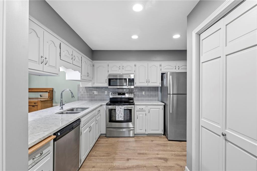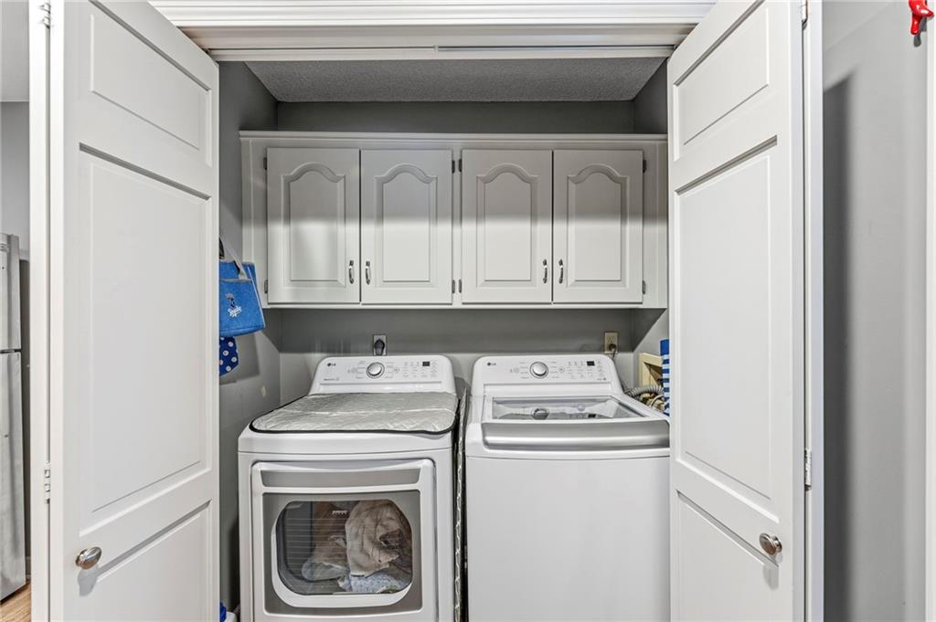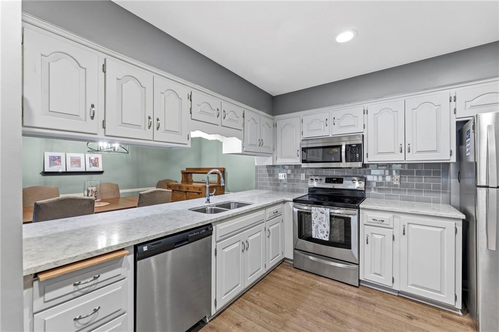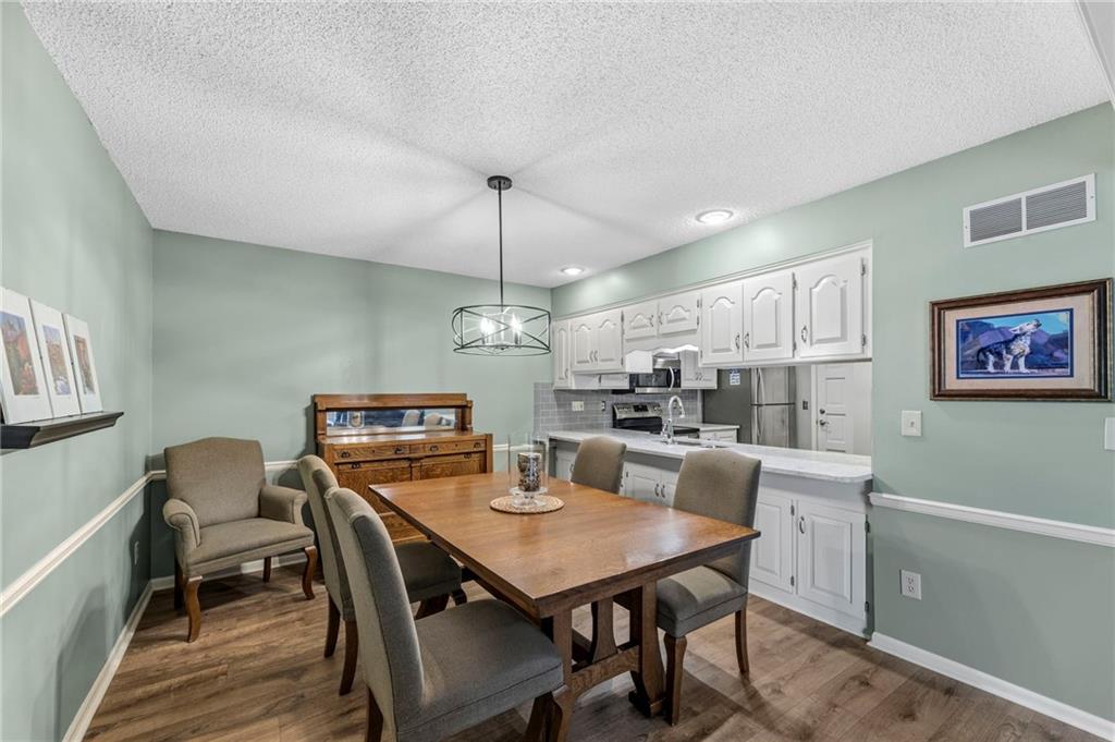 This maintenance-provided gem in the coveted Blue Valley School district combines comfort, convenience, and a truly desirable setting backing to Cross Creek Park and its scenic walking trails. A rare main-floor primary suite offers ease of living, complete with a relaxing whirlpool tub, while the fenced backyard and composite deck create the perfect space to unwind or entertain with a view. Lawn service will mow inside the fence if gate is unlocked! Inside, you’ll find gorgeous hardwood floors, soaring ceilings in the living room, and a stunning fireplace that anchors the space beautifully. The updated kitchen with modern countertops adds both style and functionality. Upstairs has two spacious bedrooms and a full bath, centered around a bright, open landing. The finished basement expands your living space with a dedicated office and built-in shelving—ideal for work or hobbies. Meticulously maintained and move-in ready, this home also includes a Platinum Home Warranty from Old Republic for added peace of mind.