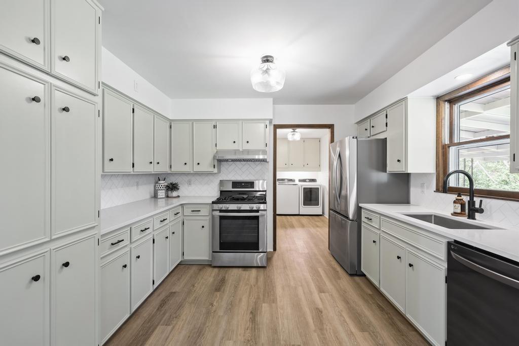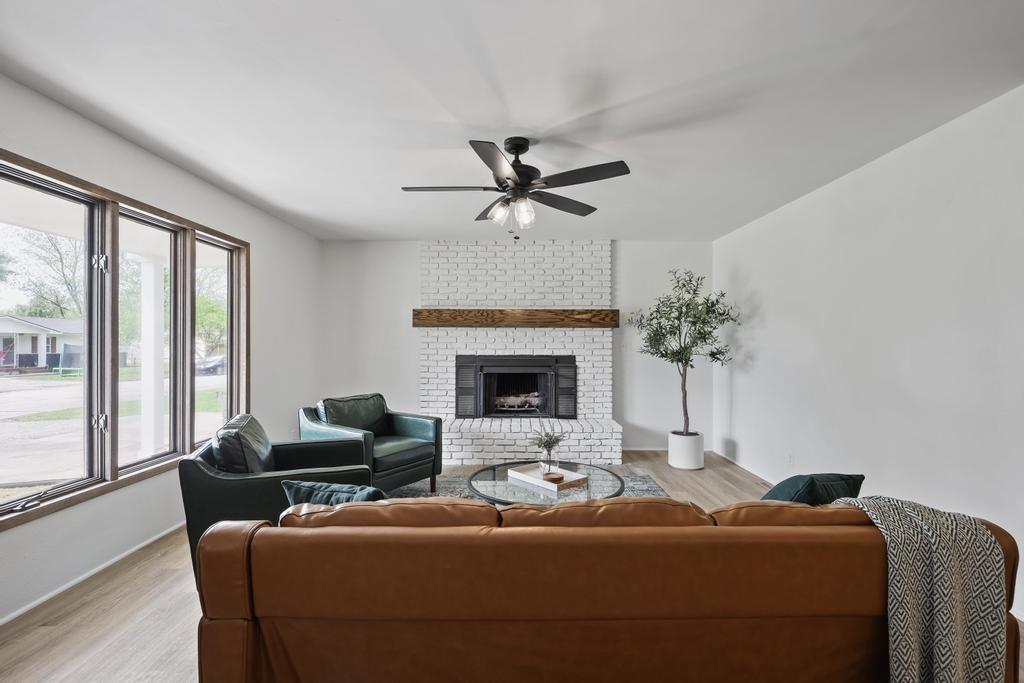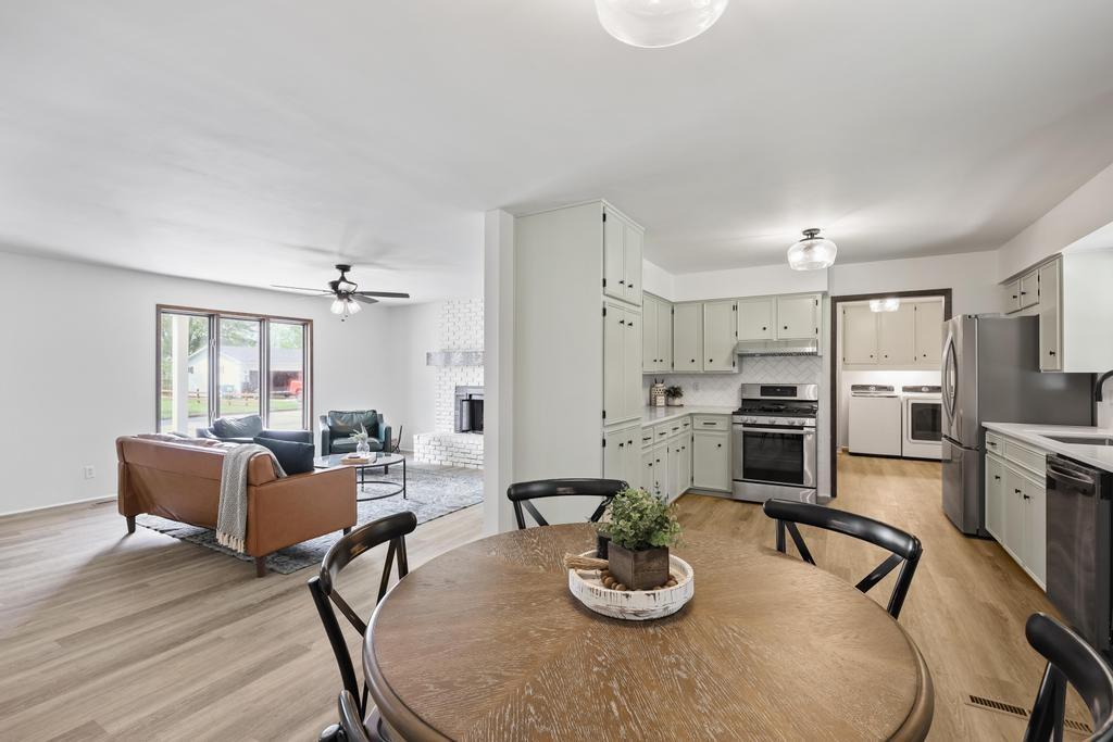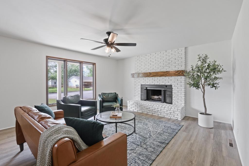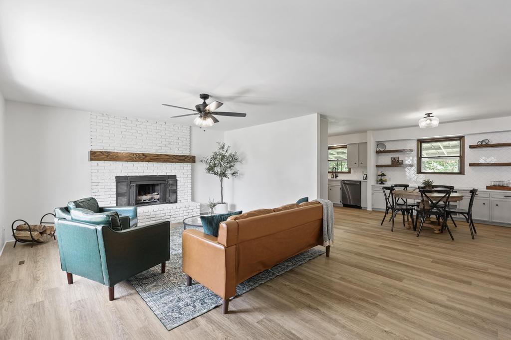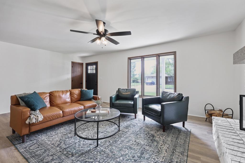 Welcome home to this beautiful fully remodeled 3-bedroom, 2-bath ranch that perfectly blends modern updates with timeless comfort! From the moment you arrive, you’ll appreciate the curb appeal, fresh exterior paint, and the brand new black Class 4 impact-resistant roof that fits perfectly into the striking color scheme and gives you peace of mind. Step inside to discover an aesthetic that perfectly blends creamy white paint, warm wood tones, and matte black fixtures for a coordinated and classy look that accentuates any style. The bright, inviting, and open interior features fresh paint and new LVP flooring throughout. Large windows and a wood burning fireplace are found in the spacious living room, which flows seamlessly to the stunning kitchen and dining area — undoubtedly the heart of the home. Showcasing gorgeous quartz countertops, white herringbone backsplash, abundant cabinetry, and stainless steel appliances (including a gas range!) — this is a kitchen that is as functional as it is pretty! The roomy primary bedroom boasts a walk-in closet and en suite bath, complete with a walk-in shower and herringbone tile details to elevate the look. Two additional bedrooms, and another full bath are found down the same hallway, along with plenty of storage! The attached 2-car garage conveniently connects to the home through the laundry and mudroom that is both functional and fashionable - because it shouldn’t be an exception to the way the rest of the home looks! Outside, you’ll love the large flat lot—ideal for entertaining, gardening, or simply relaxing under the large covered patio overlooking the backyard. This move-in ready home offers style, quality, and convenience all in one. Don’t miss your chance to make it yours!