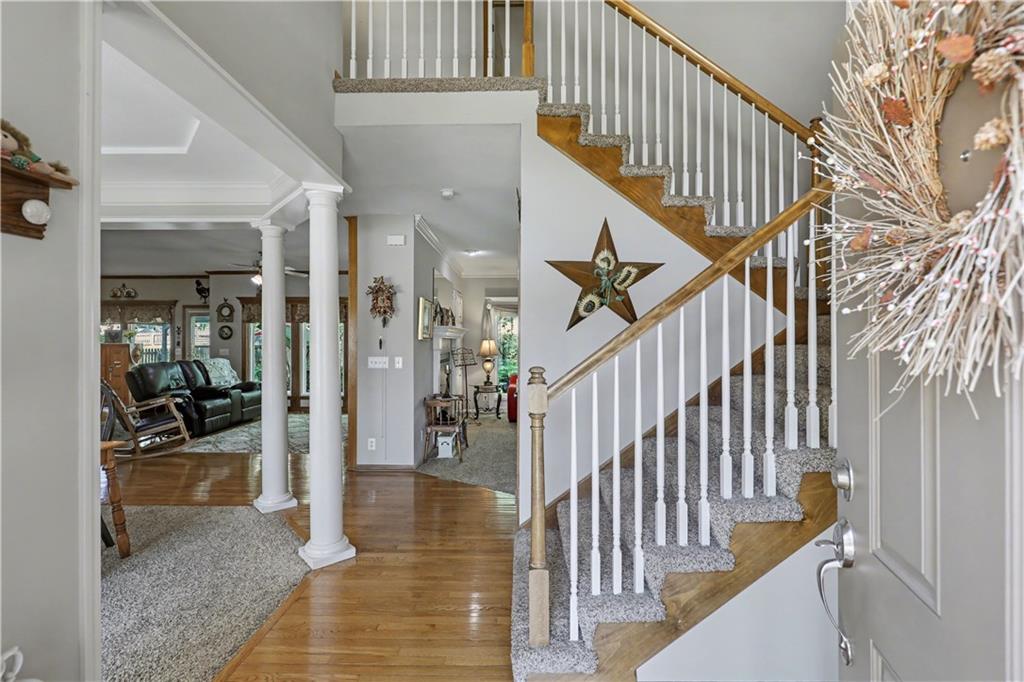 Beautifully well-maintained two-story former model home with numerous updates and a prime location near the community pool and neighborhood events. Pride of ownership shows throughout with new Champion custom windows (2025) and new HVAC system with humidifier and UVC lamp (Oct 2024). Interior and exterior paint refreshed in recent years; roof less than 10 years old. Updated kitchen features hardwood floors, granite countertops, and backsplash (2019), opening to inviting living spaces. Enjoy a see-through fireplace between the living room and hearth room, creating warmth and charm. Convenient dual laundry areas-one upstairs near bedrooms and one in the finished lower level. Basement offers additional living and entertaining space. Step outside to a fenced backyard with extended patio and pergola, perfect for relaxing or gatherings. Spacious entry landing accommodates large décor displays. Move-in ready with thoughtful updates throughout. This is one you don't want to miss! (UVC lamps installed in HVAC systems, enhance air quality by disinfecting coils, preventing mold growth, and killing bacteria/viruses in the airstream.)