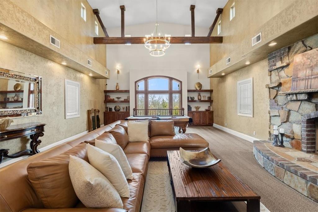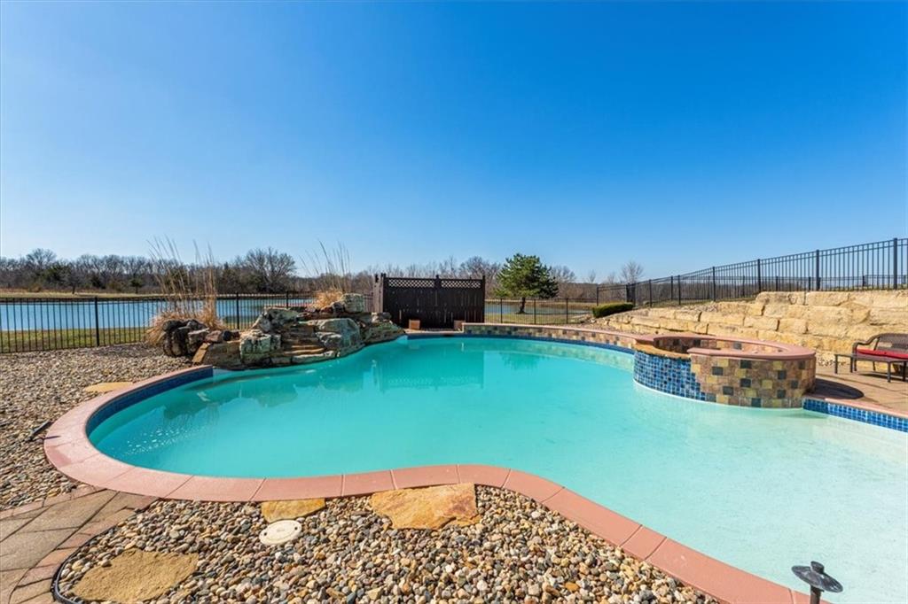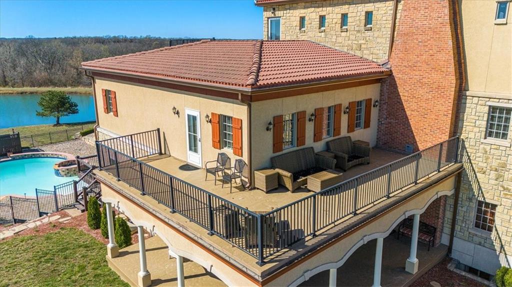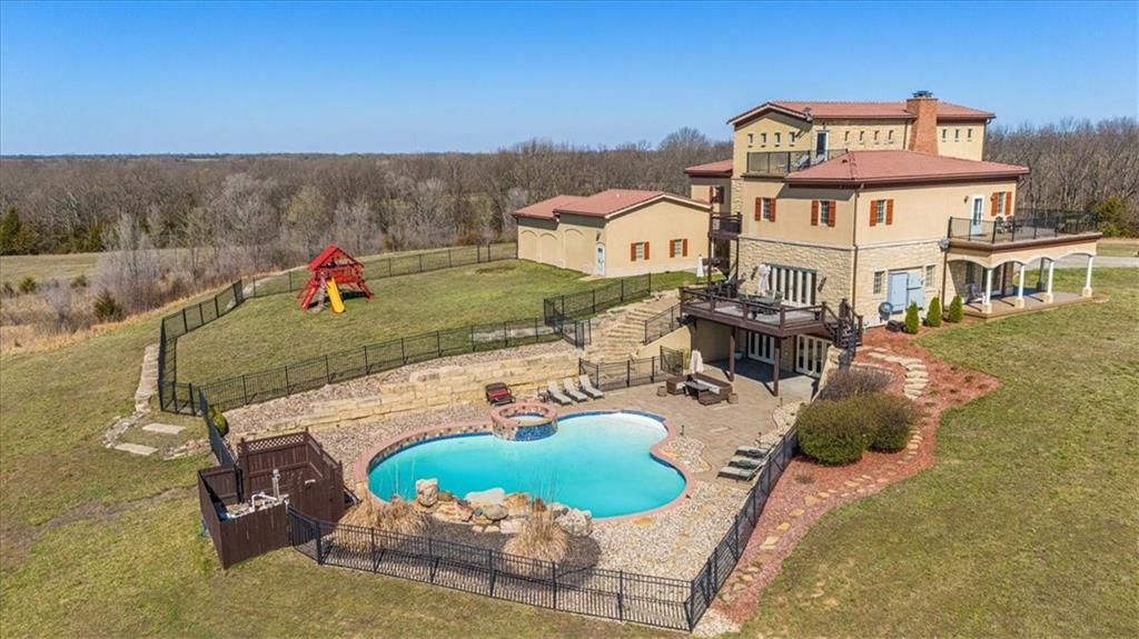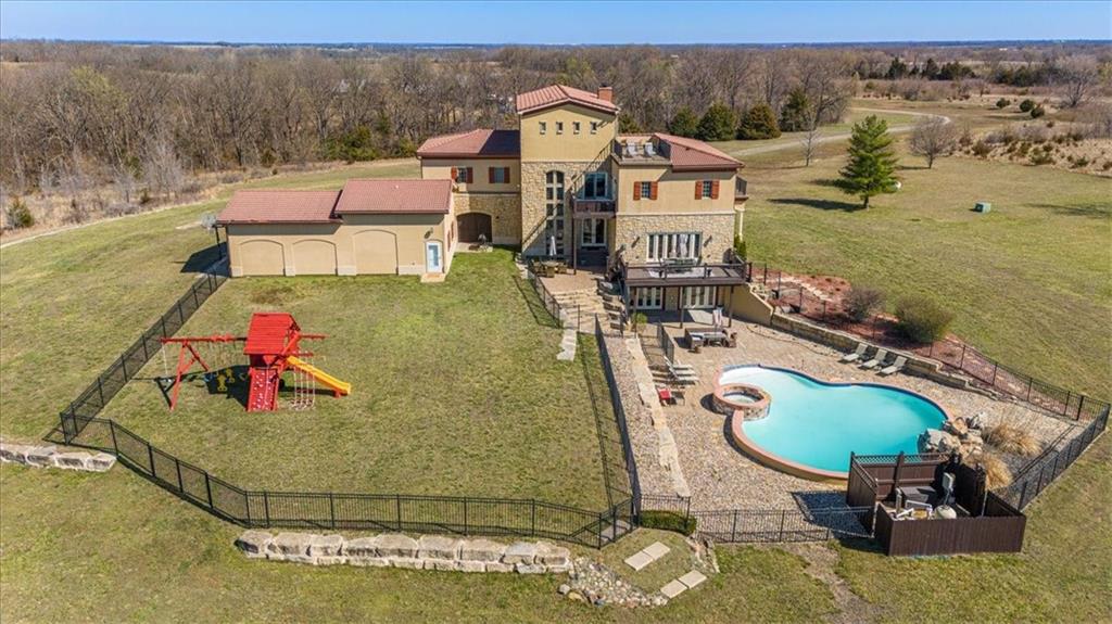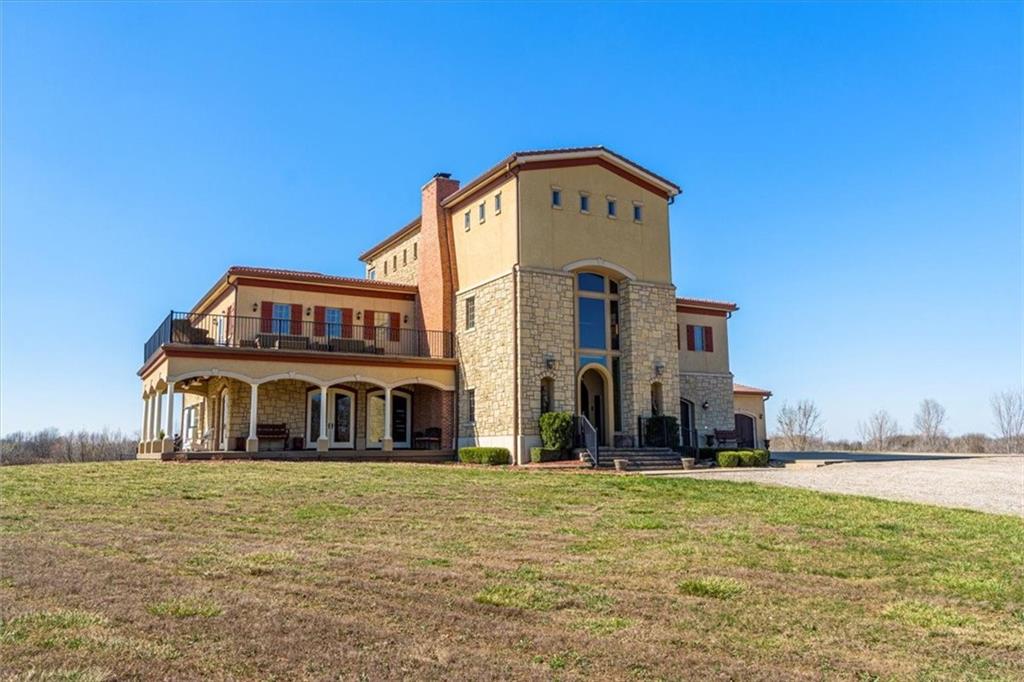 Welcome to 2343 N 600 Road, Edgerton, KS, 26.64-acre private estate blending luxury, privacy, and natural beauty. Behind the gated entrance, a tree-lined drive leads to this European Villa-inspired residence, featuring 6,491 sq ft, 5 bedrooms, 5 full and 2 half baths. The grand entryway opens to stunning interiors with soaring ceilings, arched openings, and exquisite finishes. The gourmet kitchen boasts granite countertops, custom cabinetry, double ovens, a pot filler, two wine fridges, and a butler's pantry, flowing into the hearth room with a stone fireplace, exposed beams, and a wall of windows. The formal dining room with stone flooring and a custom chandelier provides an elegant gathering space, while expansive decks and patios showcase breathtaking views of the pool, pond, and rolling landscape. The primary suite is a serene retreat with vaulted ceilings, private deck access, and a spa-like bath featuring dual vanities, a whirlpool tub, and a walk-in shower. The lower level offers a spacious rec room, stone fireplace, built-ins, and two additional ensuite bedrooms with pool access. Outdoor living is unparalleled with a heated saltwater pool and spa, a private pond with an island, and manicured grounds teeming with wildlife. The 1,200 sq ft, 4-car epoxy-floored garage is a car enthusiast's dream, while the third-floor flex space offers endless possibilities. This one-of-a-kind property provides a secluded retreat just minutes from Lawrence, Overland Park, and the KC metro. Whether you're looking for a luxury residence, vacation getaway, or your own private oasis, this estate is a must-see.