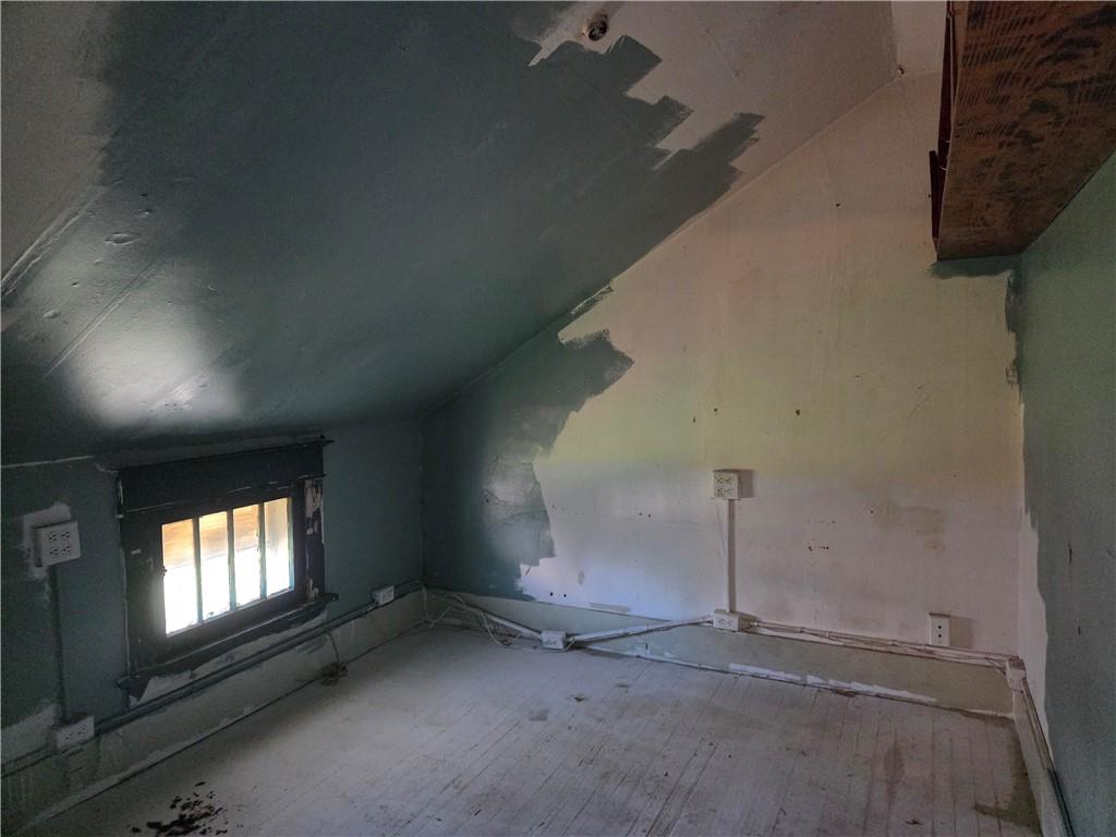 Room featuring sloped ceilings, a built-in wood-finish closet with hanging rod, and wood-finish flooring