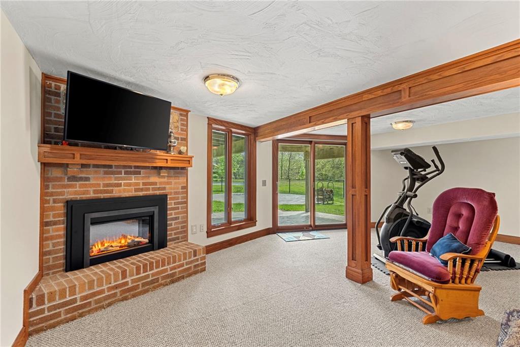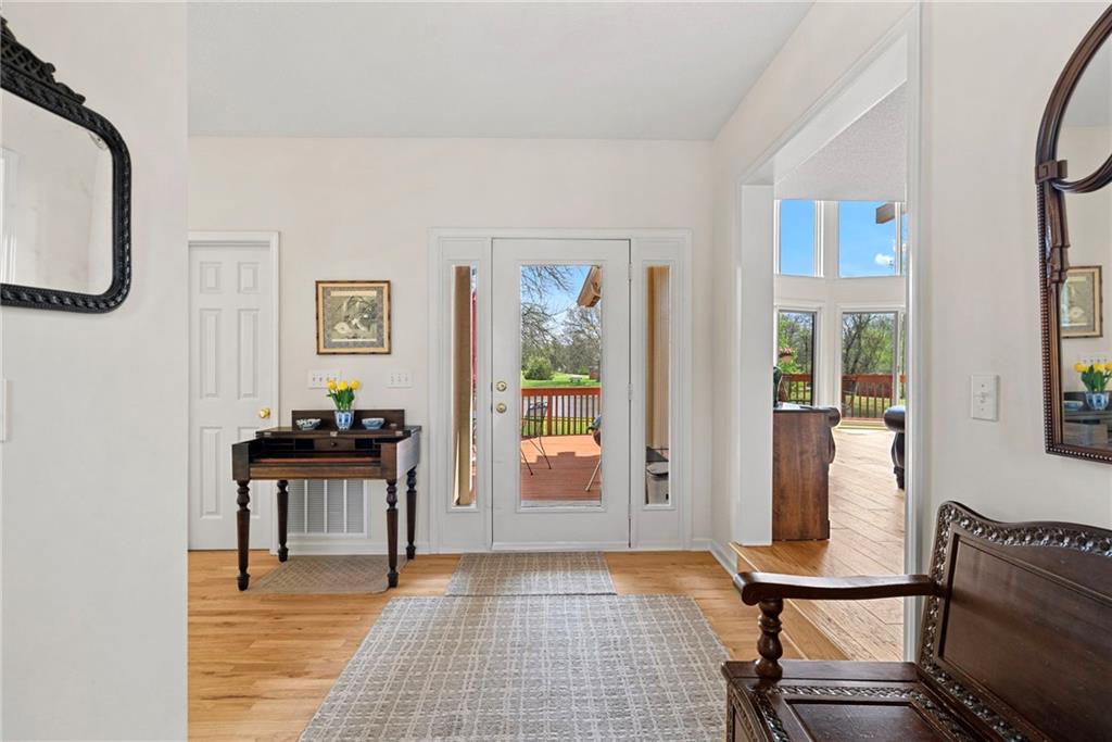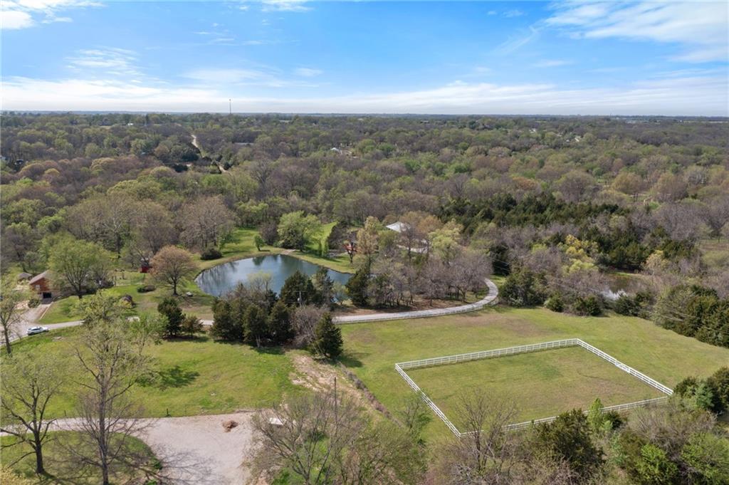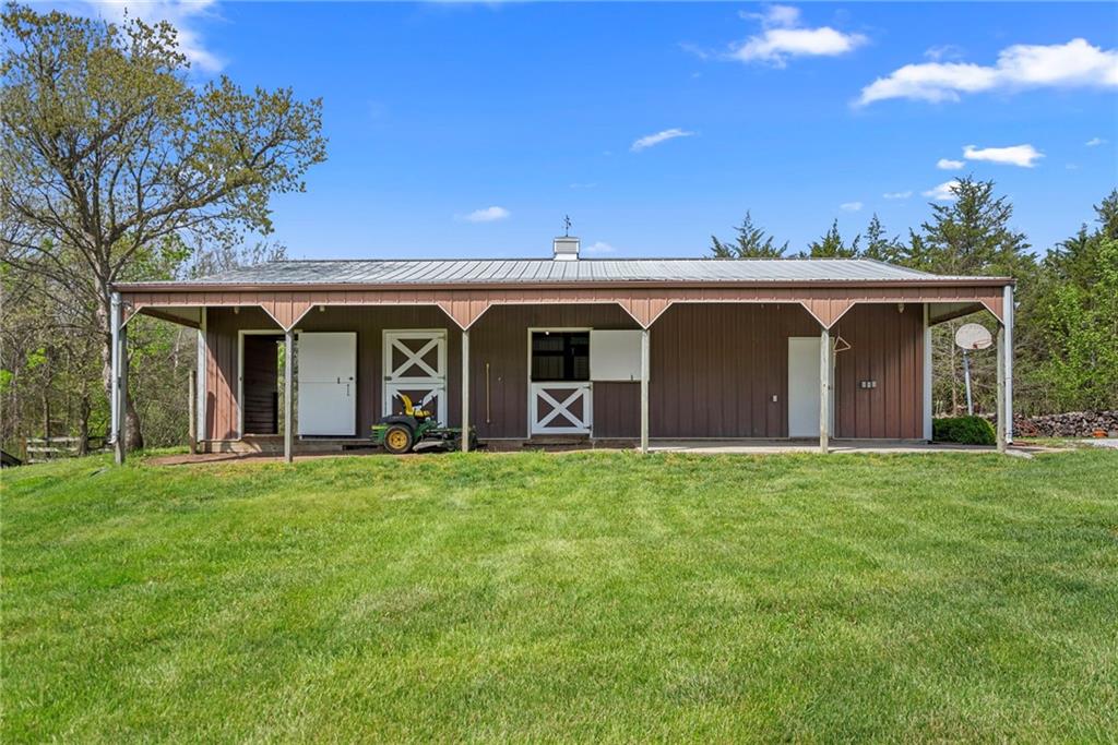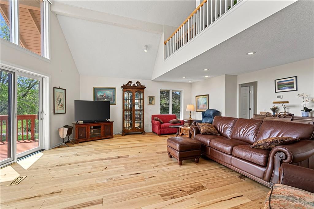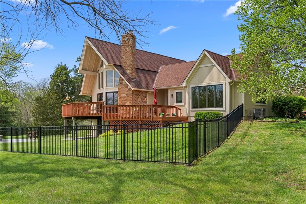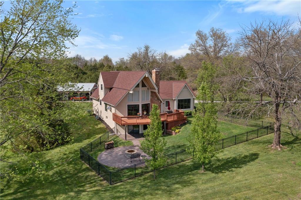 Discover a true private retreat in this one-of-a-kind A-frame estate, tucked away in a private 8-acre park-like setting just minutes from Hillsdale Lake. Designed to honor the land, this residence harmonizes rustic soul with modern functionality, offering a level of seclusion and beauty that is impossible to replicate. The heart of the home is the soaring, light-filled A-frame living area, where floor-to-ceiling windows frame incredible views of the pond and surrounding nature. This space is anchored by a majestic fireplace featuring a recently restored lifetime-warrantied flue system. The modern kitchen addition serves as a perfect bridge between the home’s original character and today’s needs, boasting custom cabinetry, double ovens, and 2021 granite surfaces. The upper level serves as a versatile getaway, featuring a full bathroom, a large bedroom, and a private landing that functions as a unique "balcony" office or nursery space. From this vantage point, you can work or relax while taking in the same expansive views from a higher perspective. For equestrian enthusiasts and hobbyists, the property features a riding arena expertly graded for drainage, an equestrian barn with 3 tongue-in-groove horse stalls, a tack room, and a shop area with reinforced concrete floors. The estate is further enhanced by a chicken coop, an aviary, and established black raspberry bushes. This meticulously maintained home offers peace of mind with a 2021 roof, dual HVAC systems under warranty, and most windows replaced in 2020-21. Located with incredible accessibility to the KC Metro, this is a rare opportunity to own a lifestyle of total privacy and architectural character without compromise.