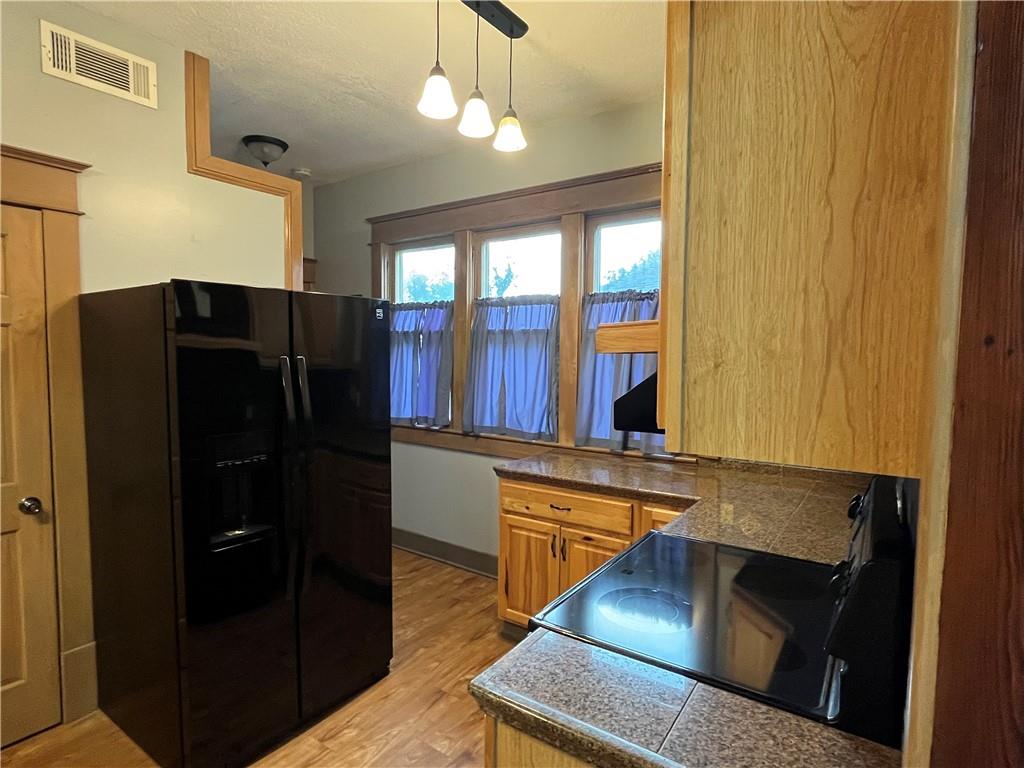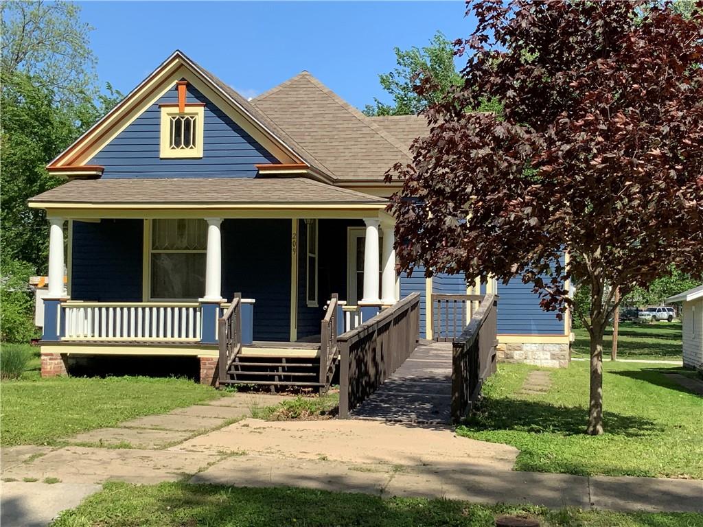 Move-in ready and full of charm, this beautifully remodeled home blends timeless character with thoughtful updates. Featuring two bedrooms and one bath, along with a spacious living and dining room. This home offers comfortable every day living, partial original wood floors, stunning woodwork, and cove ceilings with warmth and character throughout. The remodeled kitchen includes custom cabinetry, and ample storage along with cedar lined closets in the bedrooms for added appeal. The updated bathroom features a convenient walk-in shower. Enjoy peace of mind with new plumbing, updated wiring, and excellent insulation. A partial basement for extra storage space and storm shelter. Fresh paint, ramp and a spacious deck enhancing the exterior, along with alley access for convenient parking, located in a quiet neighborhood just minutes from shopping and the town square, this home is ready for you to move right in.