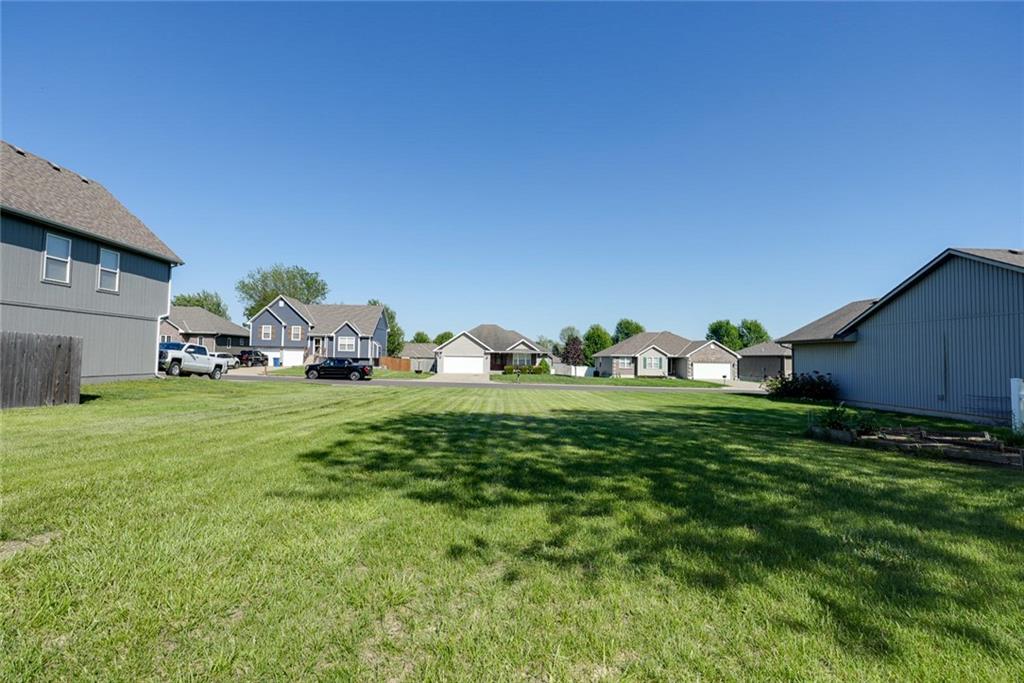 Expansive green lawn with established landscaping, bordered by a partial wood fence