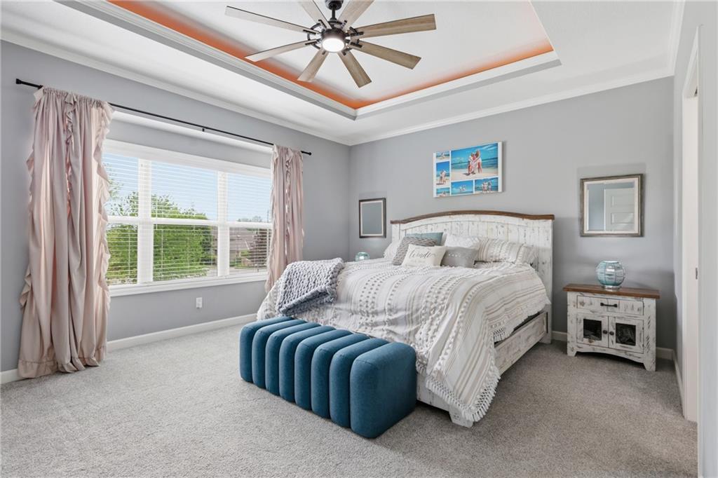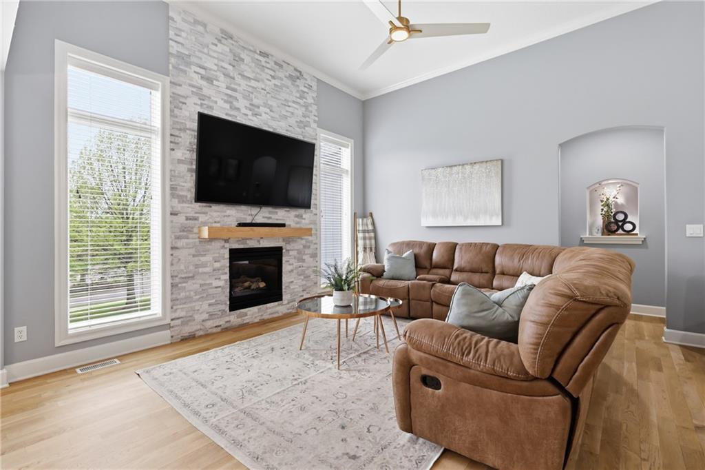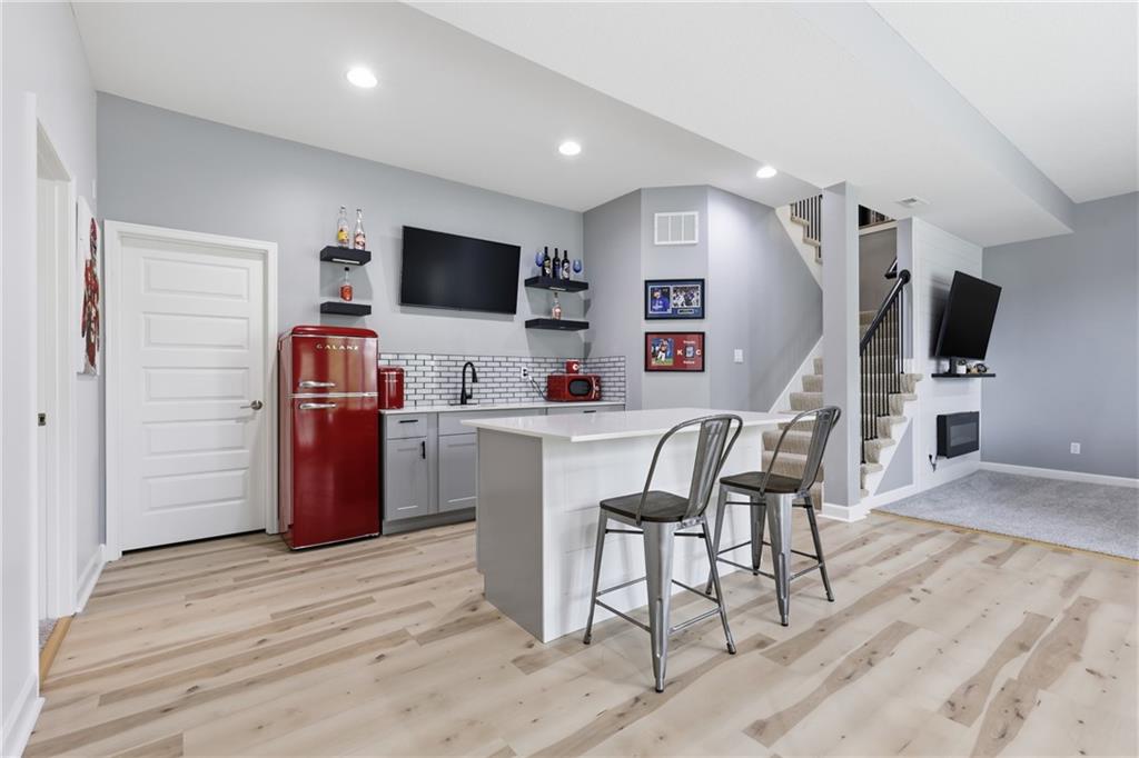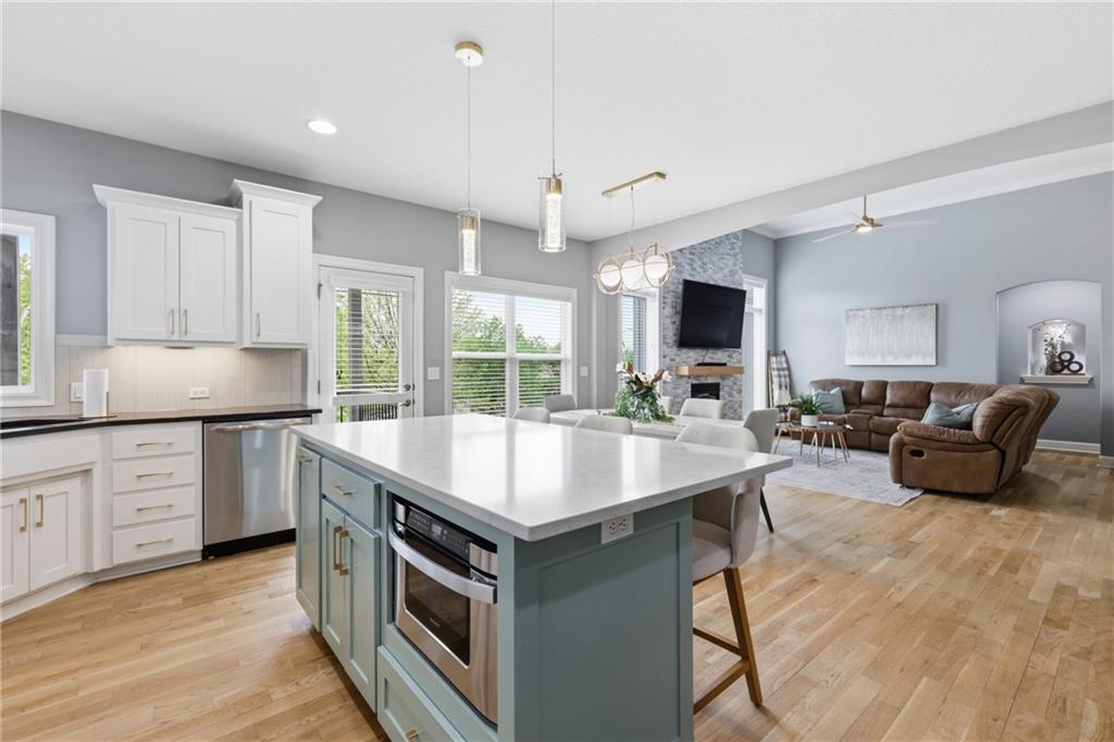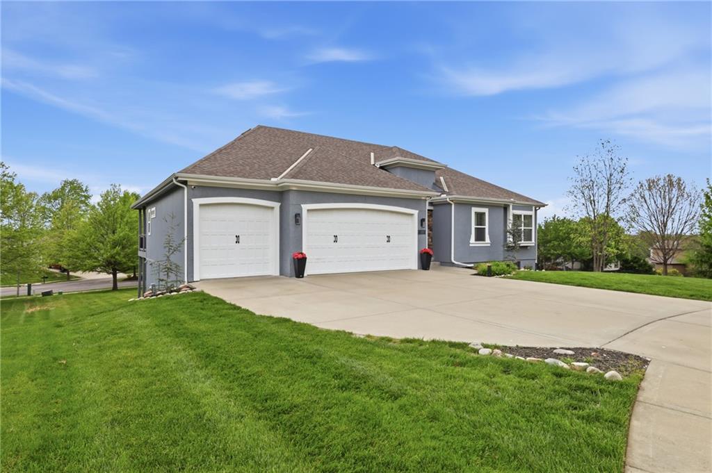 Welcome to this beautifully updated 5 bedroom, 4.1 bath home in the highly sought-after Staley Farms subdivision! With over 3,300 square feet, this home offers the perfect blend of space, functionality, and modern updates. Step inside to soaring 12-foot ceilings in the main living area, highlighted by a stunning floor-to-ceiling fireplace with brand new stone. The home features a new front door, fresh landscaping, updated lighting throughout, newer exterior paint, and select interior updates—making it truly move-in ready. The main level is ideal for multi-generational living, offering 3 bedrooms and 2.1 bathrooms. The spacious primary suite includes a luxurious ensuite with a large walk-in shower featuring dual shower heads and a walk-in closet. A freshly remodeled full bathroom adds even more value to the main floor. The kitchen is filled with natural light and flows seamlessly to the L-shaped covered deck, complete with a TV mount and party lighting—perfect for entertaining. Convenient main-level laundry and a 3-car garage add everyday ease. Downstairs, the finished basement offers incredible flexibility with 2 additional bedrooms, 2 bathrooms, a newly added kitchenette with sink and island, and ample storage space. You’ll also find a 4th garage ideal for a golf cart and a built-in reinforced safe room for safe keeping of your valueables or added peace of mind during storms. The back patio is ready for relaxation with a hot tub hookup already in place. Enjoy resort-style living in Staley Farms with neighborhood amenities that include a pool, pickleball and tennis courts, playground, clubhouse with gym and showers, basketball court, sand volleyball, and even a neighborhood restaurant. This home truly has it all—space, updates, and unbeatable amenities in one of Kansas City’s premier communities!